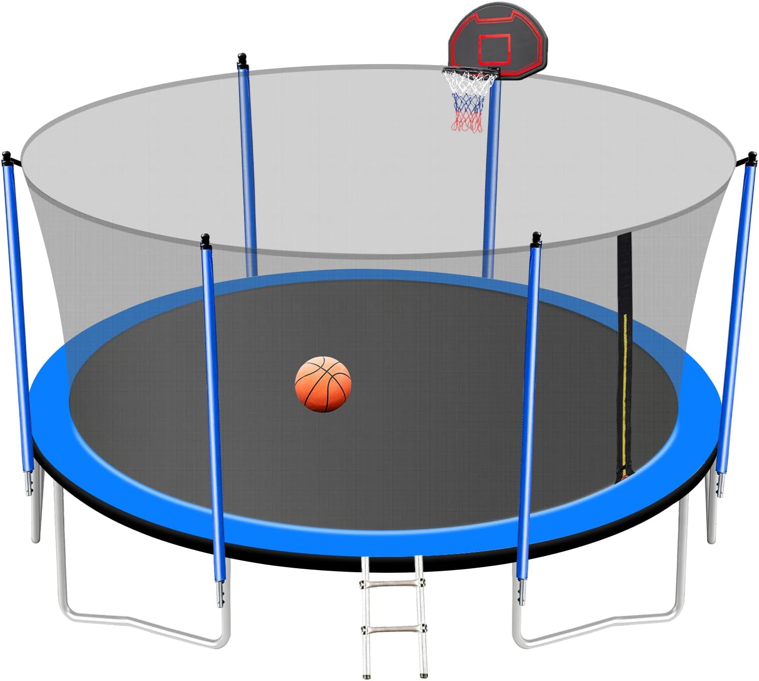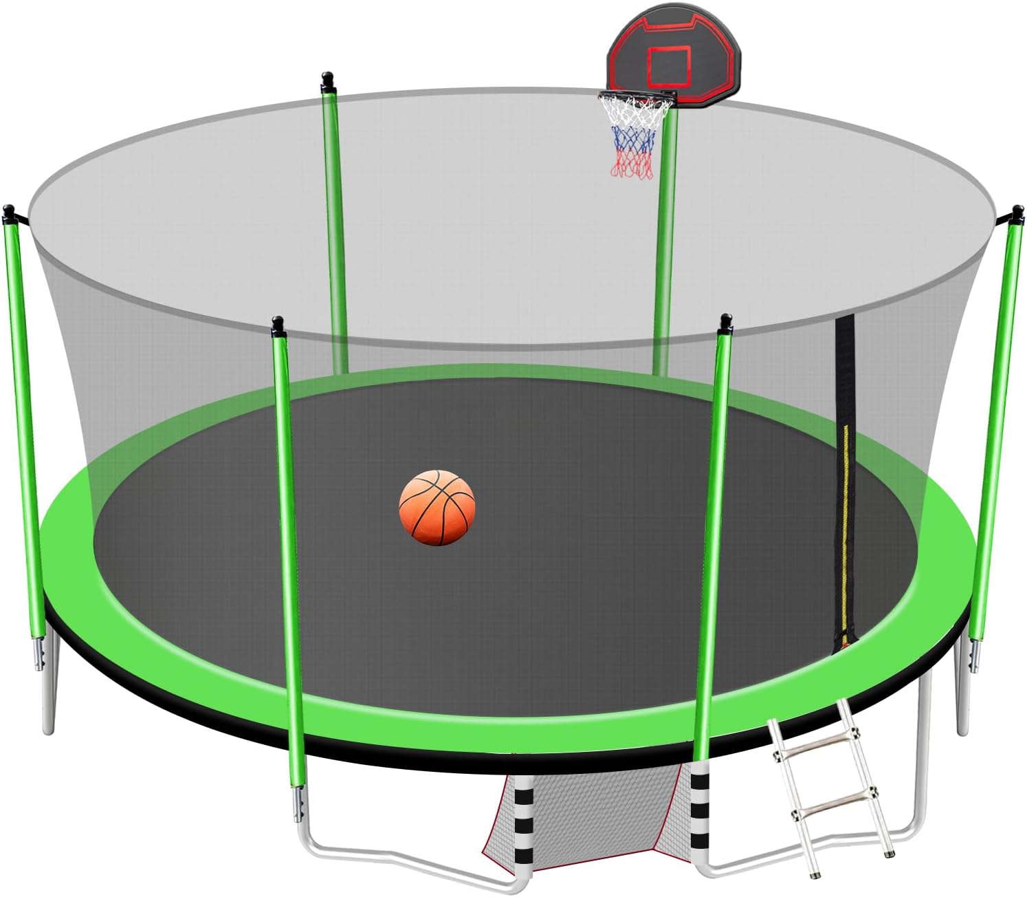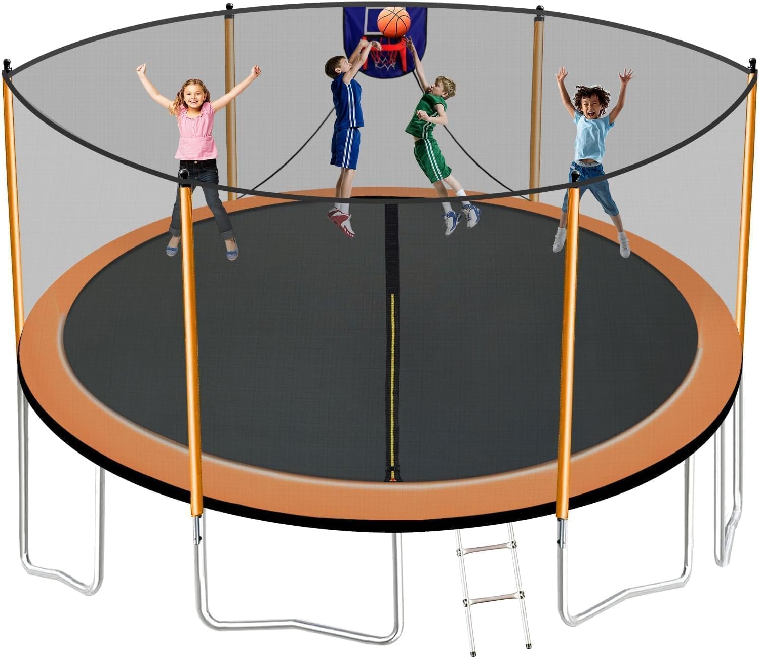 Kootlena Large Trampoline with Accessories Kootlena heavy duty Trampoline can be used year-round and provides a great way to burn calories, pack cardio into a short workout.with a basketball hoop and basketball, it's super fun to jump on.Anti-Rust Galvanized Steel Made of high-quality Galvanized steel frame, rust-resistant T-joints, foam padded with extra sleeves covered poles, strong enhanced springs and sturdy U-shaped legs,The solid structure will keep the big trampoline firmly planted on the ground while you jump your way to good health Safe Enclosure for Kids and AdultsKootlena trampoline enclosure system includes safety enclosure net, standard protective padding to cover the springs and superior jump mat to help stabilize kids while jumping. The steel ladder offer more convenience and the dual zipper with latch clip adds more protection.Providing a safe and happy bouncing experience for kids and teens when jumping on the trampoline. Specifications Max Load Weight of 16 FT Trampoline: 1500 lbs, for 8-10 kids, (SINGLE person limit: 264 lbs) Max Load Weight of 15 FT Trampoline: 1400 lbs, for 7-9 kids, (SINGLE person limit: 264 lbs)Max Load Weight of 14 FT Trampoline: 1200 lbs, for 5-7 kids, (SINGLE person limit: 264 lbs)Max Load Weight of 12 FT Trampoline: 1000 lbs, for 4-6 kids, (SINGLE person limit: 264 lbs)Max Load Weight of 10 FT Trampoline: 600 lbs, for 3-5 kids, (SINGLE person limit: 264 lbs)Safe Certification: ASTM safety certified F318-16 & F2225-15, CPC approved. Frame Construction: Rust-resistant Galvanized Steel Jump Mat: UV protected PP MaterialSimple Assembly Required: YesPackage InformationThe trampoline is divided into different packages, it may arrive at your place at different time.