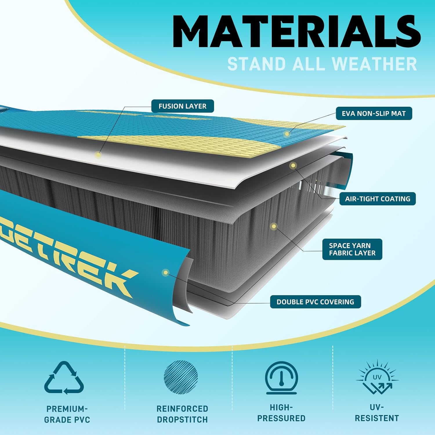 | Material Type | Drop Stitch Outer Layer, Ethylene Vinyl Acetate (EVA), Polyvinyl Chloride (PVC) |