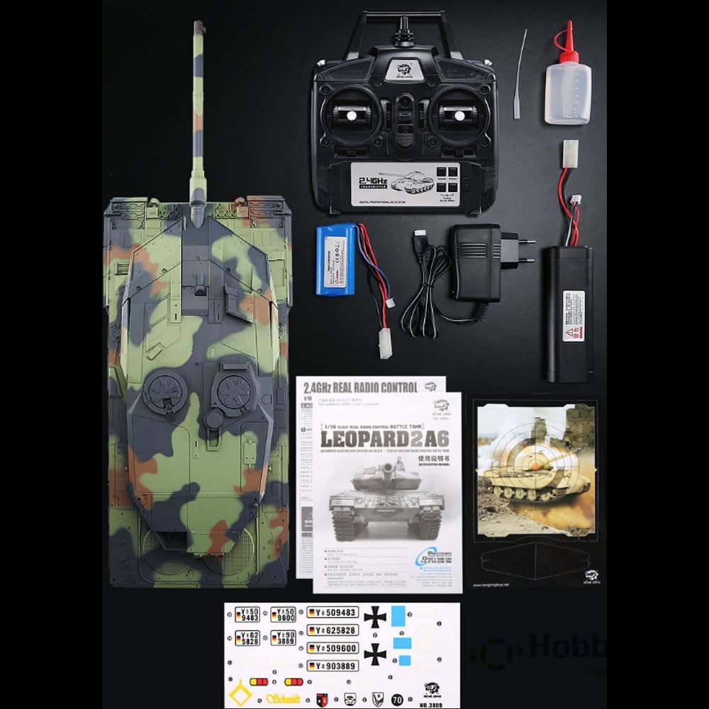 Experience the Power of the Leopard 2A6 RC Tank! This 1:16 scale Henglong Leopard 2A6 remote-controlled tank delivers unmatched realism with simulated smoke, battle sounds, and recoil action. Built for hobbyists and collectors (ages 14+), it features a full-metal suspension system, metal tracks, and independent shock absorption to conquer rough terrain effortlessly. Key Features:Infrared Battle System: Engage in multiplayer combat (6 hits trigger shutdown with vibration effects).320° Turret Rotation: Upgradeable to 360° for full battlefield dominance.Realistic Effects: Barrel recoil, LED searchlights, and engine sounds for immersive play.2.4GHz Remote Control: No frequency interference—supports multiple tanks battling simultaneously.Durable Design: Metal-reinforced rocker arms and spring suspension for superior off-road performance. Ideal for display, customization, or competitive play, this 5kg, 68.6cm-long tank is a hobby-grade masterpiece combining historical accuracy with cutting-edge RC technology.