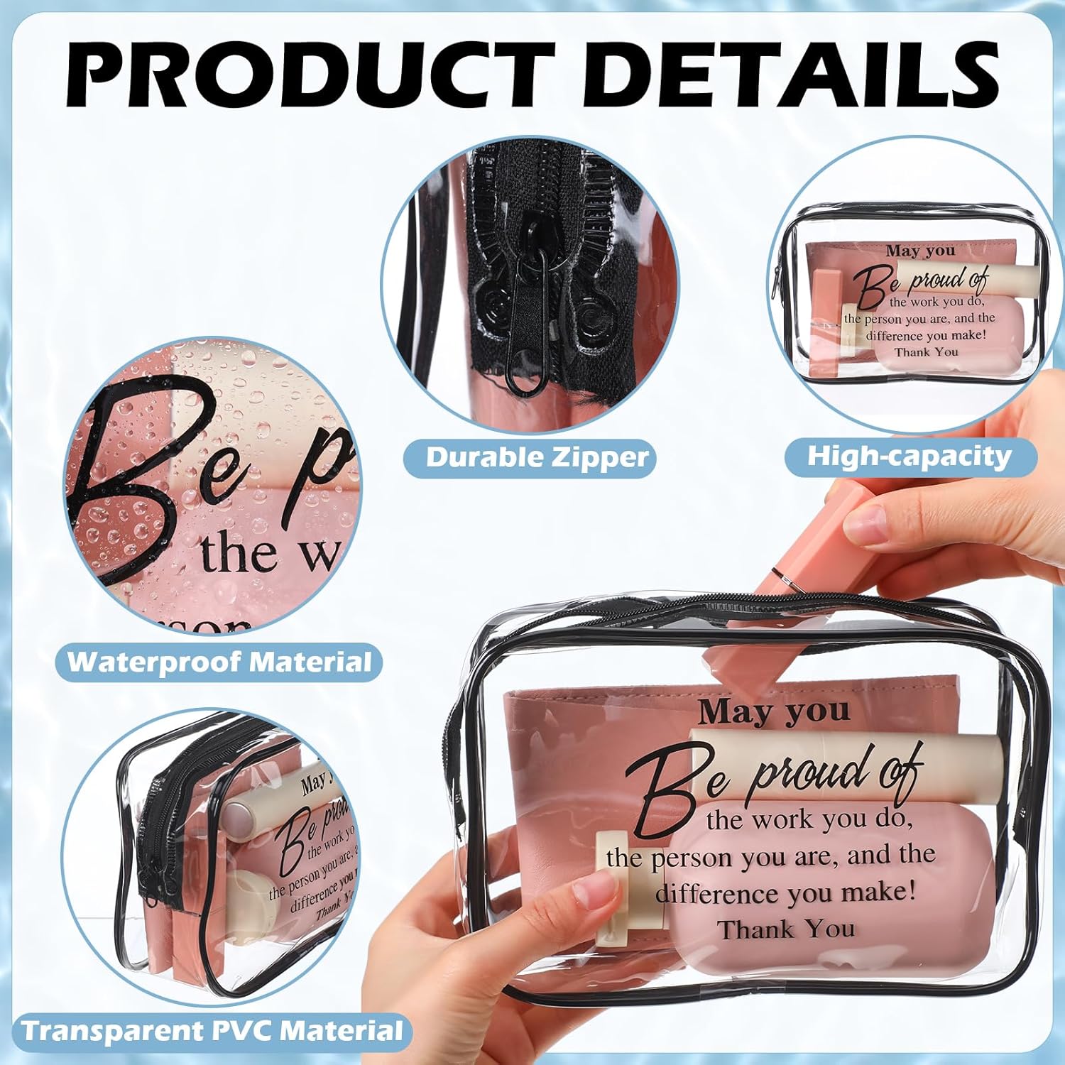 Features: Our cosmetic bag bulk is a tribute to all "may you be proud of the work you do" moments. Each clear toiletry zipper pouch, adorned with thoughtful slogans, clear toiletry bag for traveling serves as a reminder of the difference your recipients make, inspiring confidence and positivity daily. Transform the art of gifting with our inspirational gifts bulk for women. Designed to celebrate and uplift, these employee appreciation gift bags are perfect for every occasion. Whether you're expressing gratitude at a farewell gathering or acknowledging a colleague's hard work, these administrative professional day gifts and volunteer appreciation gifts provide a heartfelt gesture that resonates. Specifications: Material: PVC Color: clear, black print Size: about 7.09 x 4.72 x 2.36 inches/ 18 x 12 x 6 cm Package includes: 12 x Inspirational thank you gifts for women Notes: Manual measurement, please allow slight errors on size. The color may exist a slight difference due to different screen displays