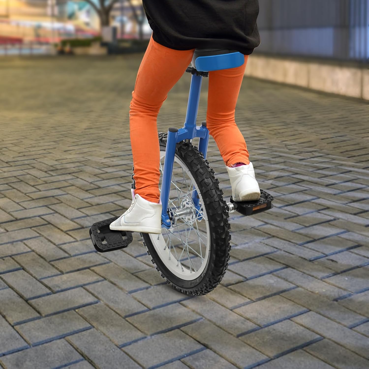 DescriptionThis 16-inch unicycle will provide you with a unique fitness experience, enhancing your physical fitness while improving your riding balance. The grips on the front and back of the seat and the lightweight body make it easy to carry, allowing you to maneuver through crowded city streets or on park trails, bringing you a different travel experience. It is not only a transportation tool but also a partner to show your own style and challenging spirit.ApplicationIt is suitable for office workers, students, cycling enthusiasts, and other people for daily fitness exercise, cycling, balance training, talent performance, etc.SpecificationColor: BlueMaterial: Manganese Steel, Aluminum Alloy, Plastic, RubberProcess: PaintingSaddle Length: 23cm/9.06inWheel Size: 40.64cm/16inMaximum Load Bearing Capacity: 50kg/110lbsSuitable Height: 1.2-1.55m/3.94-5.09ftHeight from Saddle to Pedals: 38.1-73.7cm/15-29inProduct Height: 71.1-81.28cm/28-32inSeatpost Length: About 23cm/9.06inSuitable Age: 7-60 Years OldMount Type: Free StandingAssembly Required: YesPackage Size: 38*18*41cm/14.96*7.09*16.14inGross Weight: 4.5kg/9.92lbsPackage Included1* Unicycle Frame1* Unicycle Saddle1* Wheel2* PedalsOther Accessories for AssemblyNotes1.Please check the size carefully before ordering.2.The pedal must be tightened before riding. 3.Please note that your legs should be almost straight when you sit on the unicycle and place one foot on the lowest position of the pedals. Please insert the frame to the appropriate depth for your height and then tighten it to ensure a safe ride.4.It is recommended to wear a helmet, wrist guards, and elbow pads (not included) to ensure safe riding. For safety reasons, novice riders should ride under the guidance or accompaniment of an instructor. It is better to choose an open, grassy, fenced area with firm and level dirt for training.5.Please allow the slight color difference caused by the shooting light and 1-3cm error due to manual measurement