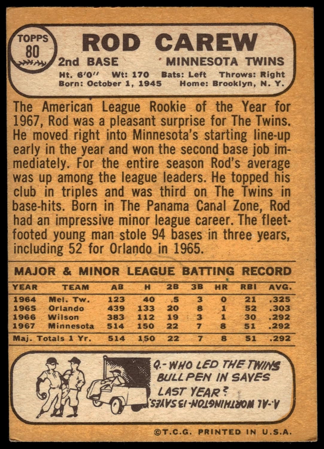 1968 Topps #80 A Rod Carew Minnesota Twins (Baseball Card) (Back is Gold in Color) VG/EX Twins. Back is Gold in ColorDean's Cards was founded in 2001 by Dean Hanley, a fellow card collector, and has become the leading online seller of vintage sports cards and non-sports cards. Our inventory has grown to more than a million vintage cards and we have a staff of 14 employees and a 5000 sq. ft. office space in Cincinnati, Ohio to offer you quick and personal service. Dean also has written two books on collecting vintage baseball cards. If you will give us the opportunity to earn your business, you will be glad that you did. We guarantee it!SN: B68T 15 1458