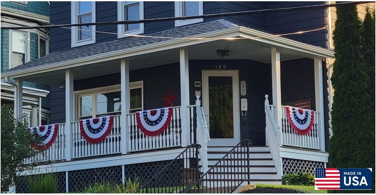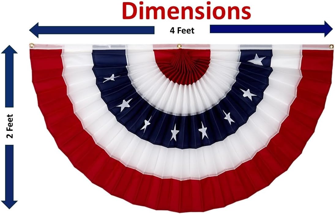 American Flag Bunting. Show your patriotism with Independence Bunting's vibrant Stars & Stripes American Flag Bunting banner (also known as Pleated Fans). Available in five sizes, each Bunting Flag comes in either an industry leading cotton blend fabric or a high quality nylon, both of which are fully sewn, not printed. These are great for hanging both indoors and outdoors. For regular long-term outdoor use, we suggest our nylon Pleated Fans. Our SolarMax nylon fabric, also used in our high-quality U.S Flags, is resistant to UV fading and color bleeding, staying vibrant even with repeated outdoor exposure. Make a patriotic statement with these long-lasting US Fan Flag Bunting. . Our nylon USA Flag Bunting with stars now come with high quality embroidered stars. . Each Patriotic Pleated Fan has 3 grommets for easy hanging. These are the only pleated fans that are actually pleated so they can fold back into their original pleats for storage, without the wrinkles and no ironing needed! . They are ideal for decorating your home, office, business, sporting events, or anywhere else your imagination allows, with a patriotic flavor! Use them to show our Country's colors for patriotic holidays like Memorial Day, Veteran’s Day, and the 4th of July! Our American Flag Bunting are also used as political decorations. There is no better way support your favorite politician at political events and rallies! . All of our patriotic pleated fans are Made in America. Built from the highest quality material and featuring superb workmanship; their colors will not run! They are easy to fold and store for decorating the next patriotic event. .