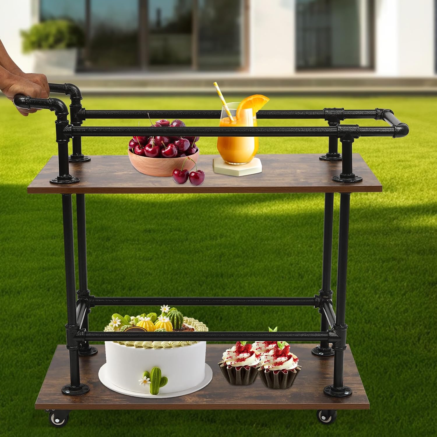 DescriptionThis industrial bar cart boasts two spacious particleboard shelves and high-temperature sprayed black steel pipes, exuding a retro and classic look and making it a versatile and practical addition to any room. Its universal wheels(two of them have brakes) make it easy to move or stop as needed for serving after-dinner drinks.SpecificationsMaterial: Particleboard, Steel PipeProcess: Soldering, High-Temperature SprayColor: Brown, Black Style: Industrial Number of Tiers: 3Shelf Type: Tiered ShelfAssembly Required: YesMounting Type: Floor MountProduct Care Instructions: Wipe with a ClothProduct Size: 85.5*40*84cm/33.66*15.75*33.07inchPackaging Size: 84*48*22.8cm/33*18.89*8.97inchGross Weight: 15kg/33 lbsNet Weight: 14.3kg/31.52 lbsPackage Included 1* Industrial Bar CartAll Needed AccessoriesNotes1.Please check the size before ordering.2.We suggest using the electric screwdriver(not included) to assemble it. 3.Please allow the slight color difference caused by the shooting light and 1-3cm error due to manual measurement, and make sure you do not mind before you order.