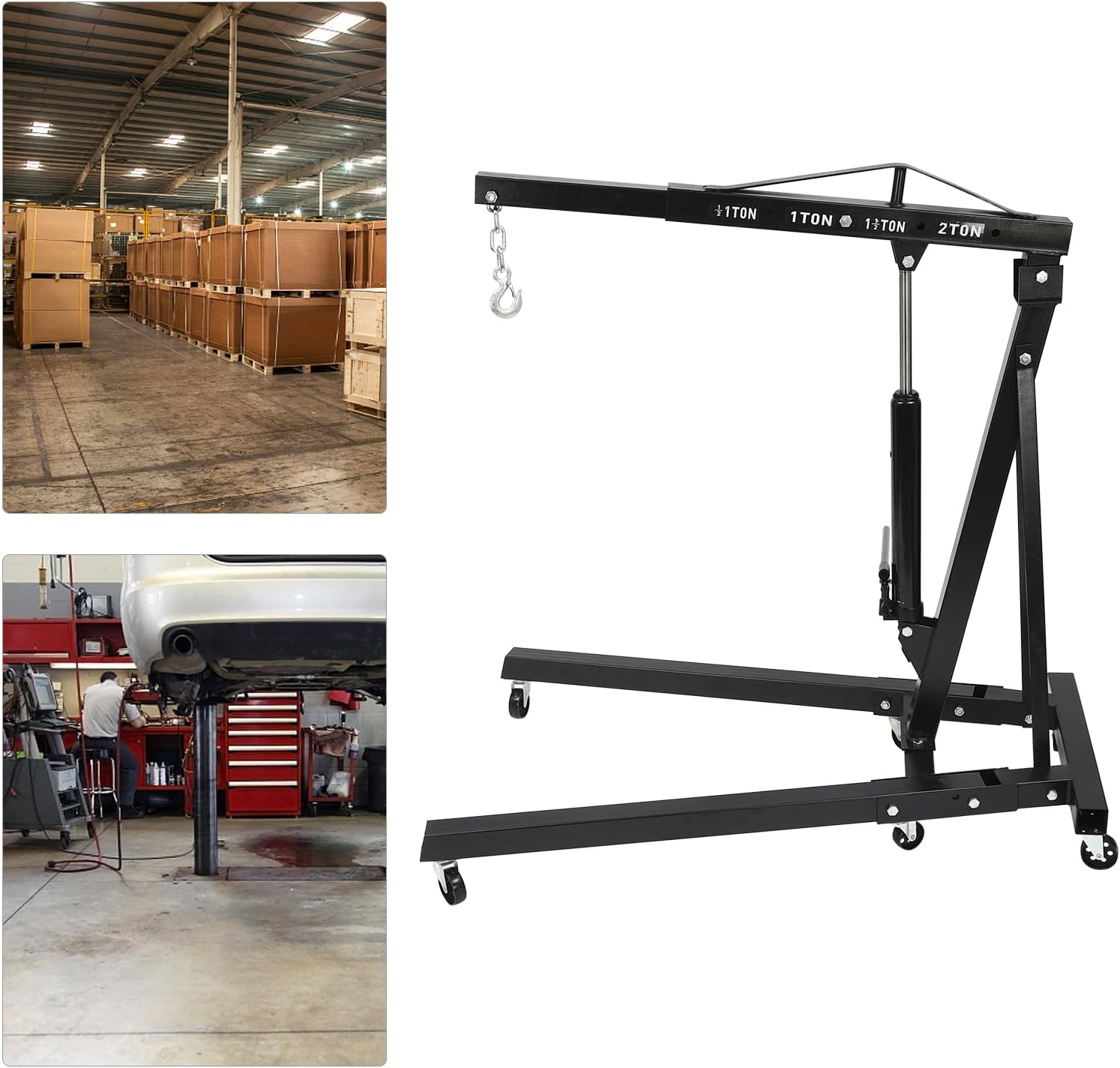 SpecificationColor: BlackMaterial: Carbon Steel, Iron, Alloy SteelProcess: Argon Arc Welding, Spraying PlasticsPower Source: Hydraulic PoweredAssembly Required: YesLifting Height Range: 0-2.1m/0-6.89ftLoad Capacity: 0.5T/1102lbs, 1T/2204lbs, 1.5T/3306lbs, 2T/4409lbsProduct Size: 165x90x140cm/64.96x35.43x55.12inchPackaging Size: 70x57x8cm/27.56x22.44x3.15inch, 134x27x17cm/52.76x10.63x6.69inchGross Weight: 14kg/30.86lbs, 50kg/111.11 lbsDetailsTough Hook: Made of alloy steel, it is durable and helps hang the goods without easily falling off.Pre-drilled Holes: The pre-drilled holes on these brackets allow for easy and convenient assembly, saving you time and energy.ApplicationIt is a good partner for car fixing, workshops, garages, etc., and is applicable for lifting cars, car axles, engines, motorcycles, transmissions, transfer boxes, and other heavy things whose weight is under 4409 lbs.Package Included1x Folding Engine Hoist1x English ManualAll Accessories for AssemblyNotes1.We send the folding engine hoist separately, please wait patiently for all parts to arrive.2.It is for lifting purposes only, not for supporting loads. Please do not overload its rated capacity.3.After lifting, please promptly support the load with rated safety stands or equivalent blocking.4.Please read the label on the machine carefully before installation and use.5.Please allow the slight color difference caused by the shooting light and 1-3cm error due to manual measurement, and make sure you do not mind before you order.