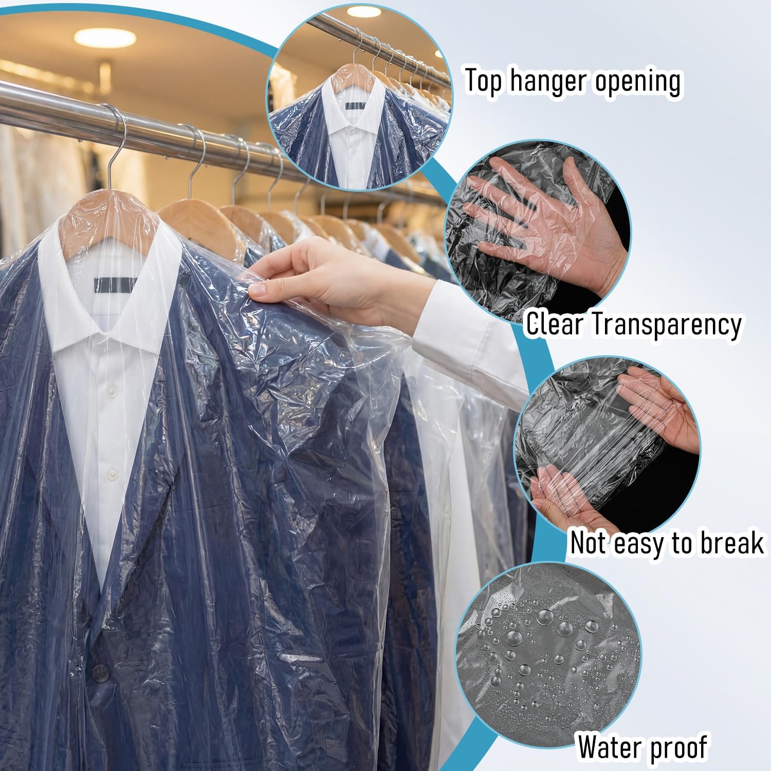 Features: Includes 200 garment bags in one set, suitable for dry cleaners, laundries, retail stores, or household use. The bulk format supports frequent garment handling and replacement needs while simplifying inventory management. Open-top design allows easy use with standard hangers for hanging storage. Bags slide smoothly over garments and hangers, supporting quick covering and removal during daily use. Hangers are not included. Specifications: Material: pp plastic Color: clear Size: about 60 × 90 cm / 23.6 × 35.4 inches Package includes: 200 x Dry Cleaning Garment Bags Notes: Manual measurement, please allow slight errors on size. The color may exist a slight difference due to different screen displays.