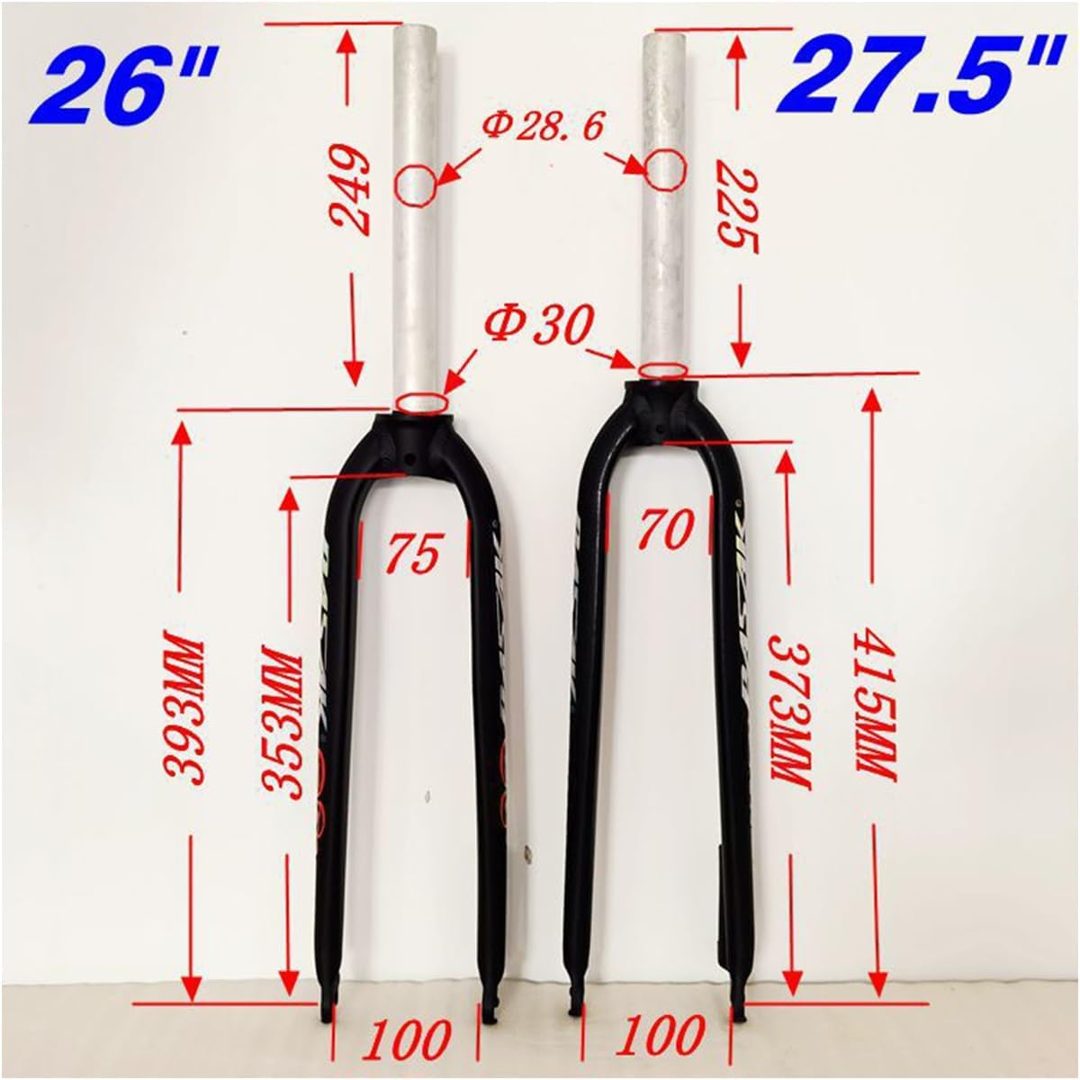 Mountain Bikes Rigid Fork, 26in 27.5in Aluminum Alloy Bike Hard Fork Disc Brake 9*100mm Quick Release Front Fork, 1-1/8'' Straight tube Mountain Bikes Rigid Fork Information:Color: Black , Black red , Black green , Black blueSize: 26in 27.5in Tires: Max 2.3inchMaterial: 6061 Aluminum AlloySteerer tube type: 1-1/8'' Straight tubeSteer Tube Diameter: 28.6mmBottom File: 30mmSteerer tube lenth: 249/225mmQuick Release: 9*100mmBrake: A-pillar Disc brake Scope of application: Mountain BikesFeatures: Fine fish-scale weldingWeight: About 794/773gPackage:Rigid Fork x 1Note:1. Please allow slight dimensional tolerances due to manual measurements, lighting in photography may cause color differences from real life.2. Please check the size details in our list carefully according to the actual condition of your Bikes to make sure you buy the fit fork.3. Due to different production batches, there may be slight differences in the color, appearance, shape, and details of individual parts. If you have any questions, please feel free to contact us, thank you!
