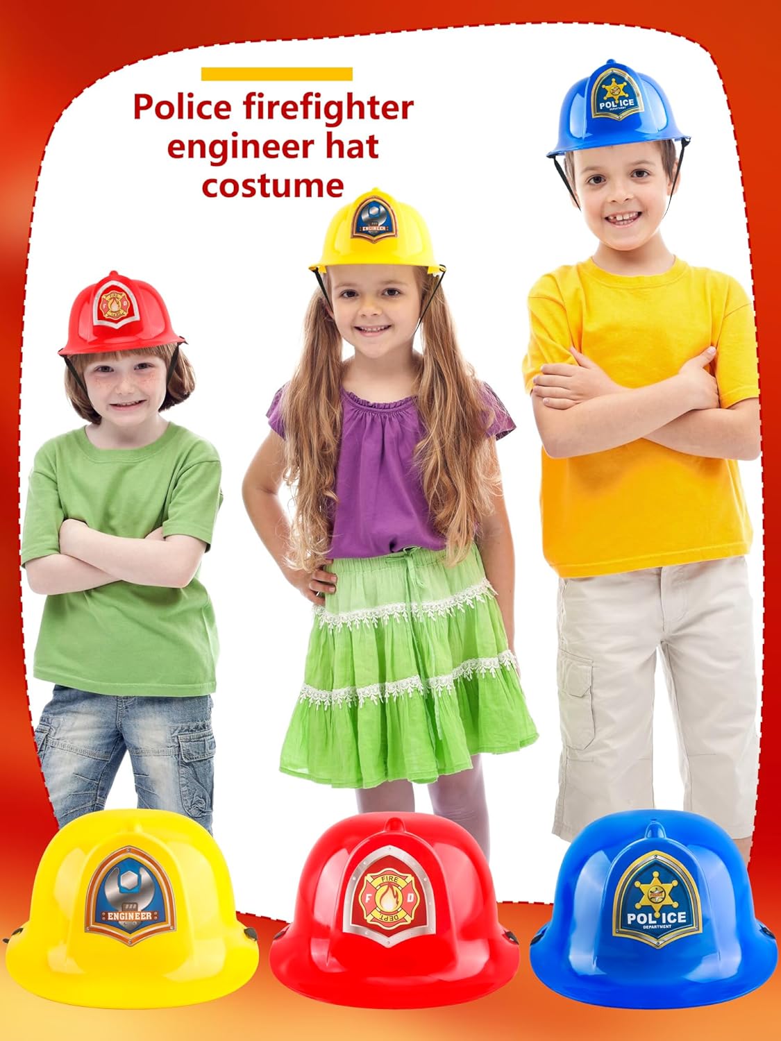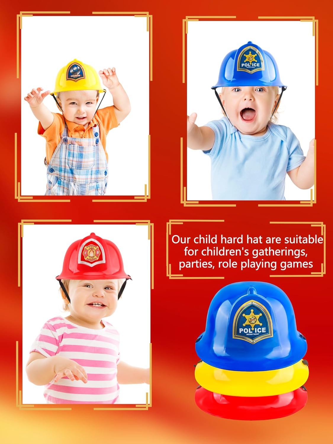 【Kids Hard Hat Suitable Occasion】: our child hard hat are suitable for children's gatherings, parties, role playing games, and are also suitable for educational props to cultivate children's thinking and creative abilities 【Specification】: Material: plastic Color: as the picture shown Quantity: 3 pcs 【Package include】: 3 x Child Hard Hat