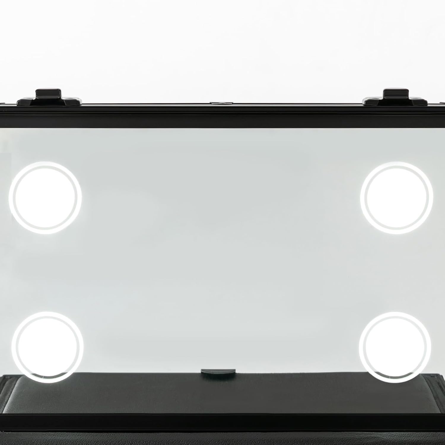 DescriptionDo you want luxury and durability at work or at home? You can find it here! The rolling makeup case is made of high-quality materials, sturdy and durable. The large capacity of the three-tier design allows you to partition and store different cosmetics, hair tools, and more. Together with the minimalist style, universal wheels, 3-position retractable trolley bar, and comfortable top handle, it makes your daily make-up work more convenient.Key FeaturesSolid and Durable: This product is made of high-quality plastic, aluminum alloy, and PVC, not easy to fade, ensuring a long service life.Protect Your Privacy: Locking latches securely protects valuables inside the case and maximizes your privacy. Multiple Power Sources: This product comes with a 3.3ft long USB cable and a 4.92ft long power cable, which reduces the limitation of the use of the site, allowing both indoor and outdoor use. Highly Portable: The easy-to-move universal wheels, three-position telescopic trolley rod, and a top handle make it easy to move the case up and down stairs, in and out of the car, and in the lift.Easy to Assemble: Simple structure and minimalist design mean you don't need other additional installation, you just need to install the universal wheels and start to use them. Simple and Generous: The pure black color, patternless design, and three-dimensional structure make it show a high-end atmosphere.Details2 Keys: The configuration of two keys prevents the worry of losing or forgetting one key. It also enables you to open the case easily.Wide Opening: With a wide opening(14.76*9.65in), it is easy for you to store and retrieve certain items without messing up other items in the box. SpecificationsMaterial: Plastic, Aluminum Alloy, PVCColor: BlackStyle: ModernShape: RectangularAssembly Required: YesMounting Type: Floor StandingWheel Type: Removable Universal WheelCarrying Method: Hand-held, Hand-pulledLight Source: 4*LEDsLight Colour: White, Yellow, NeutralColour Temperature: 3000-6500K Voltage: 12VPower: 20WLoad Bearing Capacity: 30kg /66.1lbsNumber of Tiers: 3Plug Type: US StandardUSB Cable Length: 1m/3.3ftPower Cable Length: 1.5m/4.92ftTelescopic Rod Extension Height from Case: 36cm/14.17inLED Functional Area Height: 5cm/1.97inBulkhead Functional Area Height: 9cm/3.54inBottom Box Height: 37cm/14.57inOverall Product Size: 37.5*24.5*51cm/14.76*9.65*20.08inGross Weight: 8.1kg/17.9lbsNet Weight: 8kg/17.6lbsPackage Size: 60*42*31cm/23.6*16.5*12.2inPackage Included1*Rolling Makeup Case 4*Universal Wheels2*Keys1*USB Cable 1*Power Cord