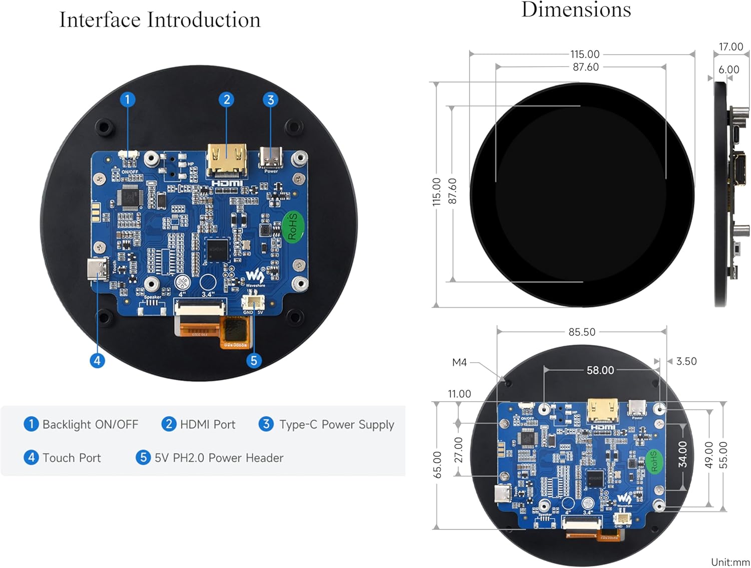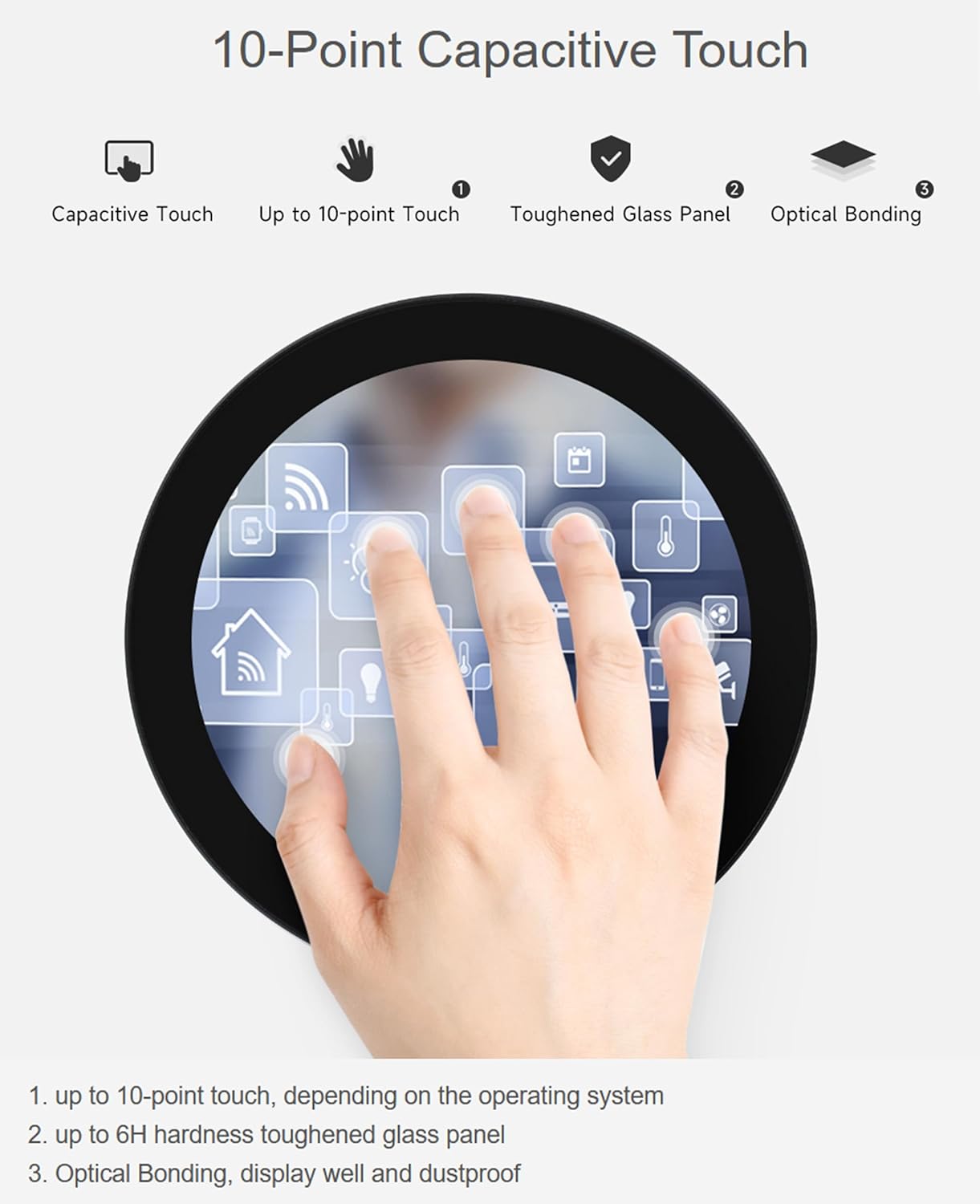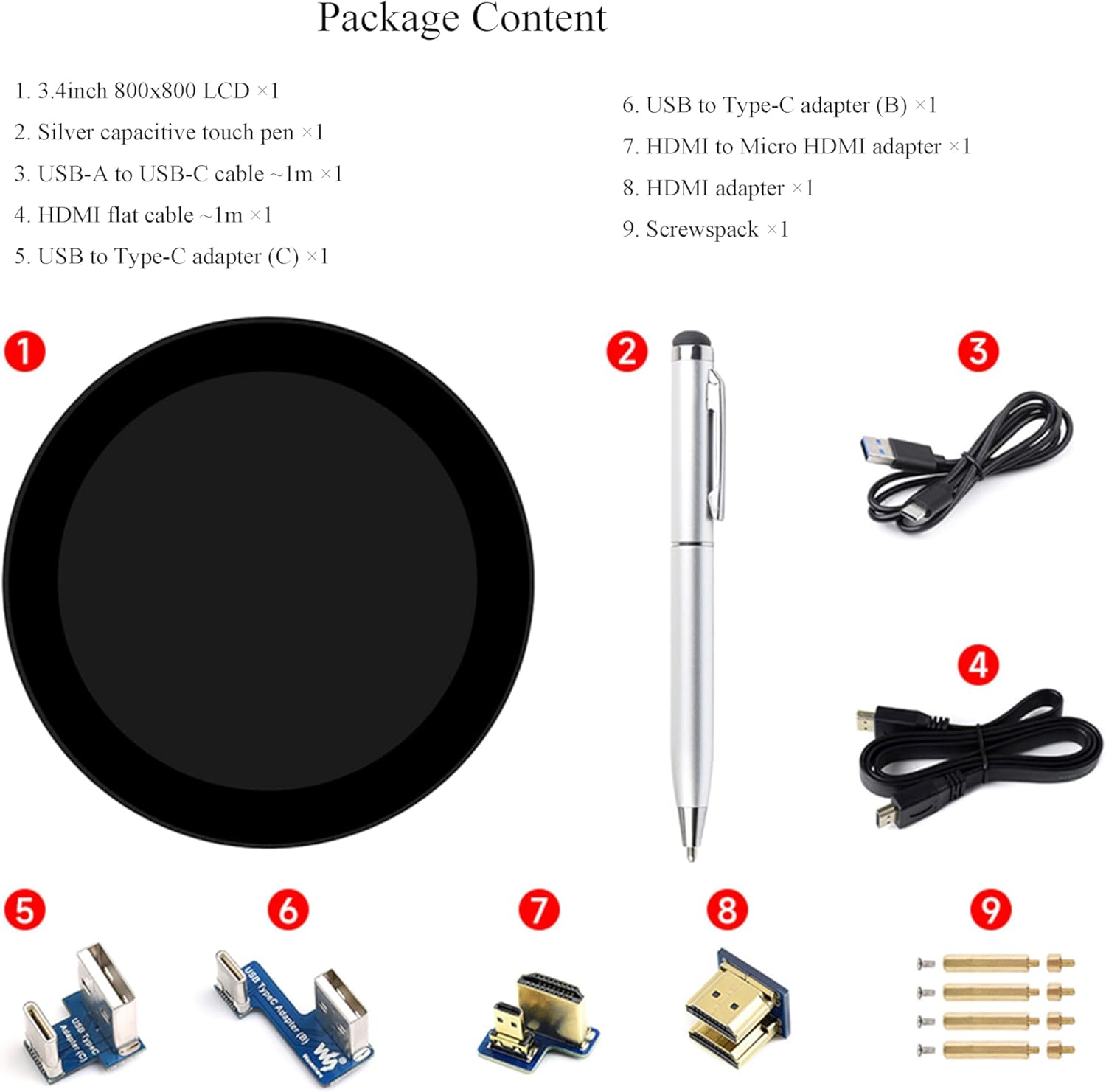 3.4inch HDMI Round Touch Display, 800 × 800, IPS, 10-Point Touch, Round LCD, Optical Bonding Toughened Glass Panel Features 1. 3.4inchround Touch Screen, 800×800 hardware resolution. HDMI Display interface. IPS Display Panel. Excellent Display Performance With 170° Wide Viewing Angle 2. 10-point capacitive touch, with toughened glass panel, hardness up to 6H 3. Compatible with all versions of Raspberry Pi: Supports Raspberry Pi OS, 10-point touch, driver free Supports Ubuntu / Kali / WIN10 IoT, single point touch, driver free Supports Retropie, driver free 4. Compatible with Jetson Nano, Supports Ubuntu, single point touch, driver free 5. Compatible with PC, Supports Windows 11 / 10 / 8.1 / 8 / 7 when used as a computer monitor. 10-point touch, driver free 6. Adopting optical bonding technology, the display effect is better Specification Model: 3.4inch 800x800 LCD Size: 3.4 Inch Viewing Angle: 170° Resolution: 800×800 Pixels Overall Size: 115.00(H)×115.00(V)×17.00(D) mm Display Area: 87.60(H)×87.60(V) mm Color Gamut: 70% NTSC Maximum Brightness: 300 cd/m² Contrast: 1200:1 Backlight Adjustment: Button dimming Refresh Rate: 60 Hz Display Interface: Standard HDMI Interface Power Port: 5V Type-C Power Supply Power Consumption: 1.5 Watt Application Example Smart Home In-Vehicle Devices Consumer Electronics Industrial Equipments Package Content 3.4inch 800x800 LCD ×1 Silver capacitive touch pen ×1 USB-A to USB-C cable ~1m ×1 HDMI flat cable ~1m ×1 USB to Type-C adapter (C) ×1 USB to Type-C adapter (B) ×1 HDMI to Micro HDMI adapter ×1 HDMI adapter ×1 Screwspack ×1