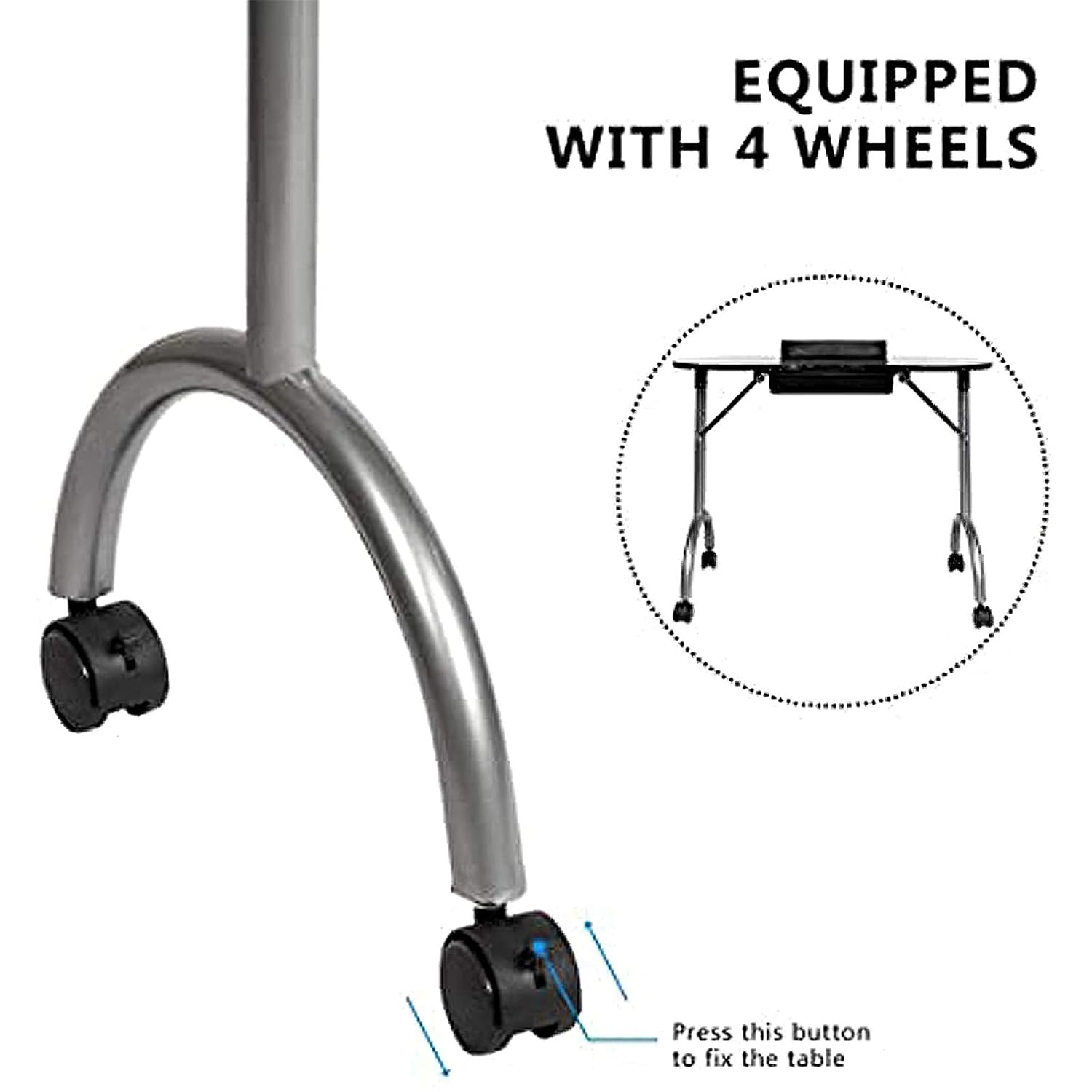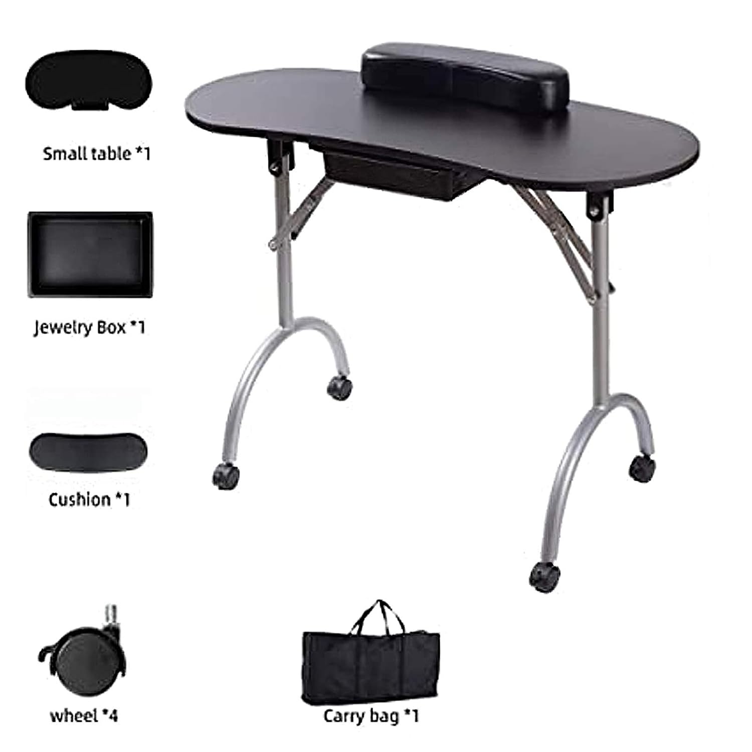 Features 1. Professional design: This nail art table is designed with detachable and super comfortable armrest pads and easy-to-carry folding metal feet. The waterproof zipper bag is convenient for storage and transportation. The corners of the nail table are rounded. , To prevent damage caused by collision. 2. Super strong: the table legs and the tops of the table are fixed with a triangle bracket to make the table more sturdy, without worrying about the table shaking during the manicure process. 3. High-quality materials: This portable manicure table is composed of high-density particleboard, metal legs, plastic drawers and sponge cushions. 4. Movable, foldable, portable, stable: 4 lockable rollers, motion controllable; you can lock the angle and wheels to ensure stability; you can fold it up and put it away when you donât need it. 5. Easy to assemble and light weight: The sturdy portable nail table is very fast and easy to assemble. This most efficient manicure table is perfect for nail art studios at home or traveling nail technicians. Specifications: Product Name: Nail Table Quantity: 1 Pc Color: Black Package Included: 1xNail Table