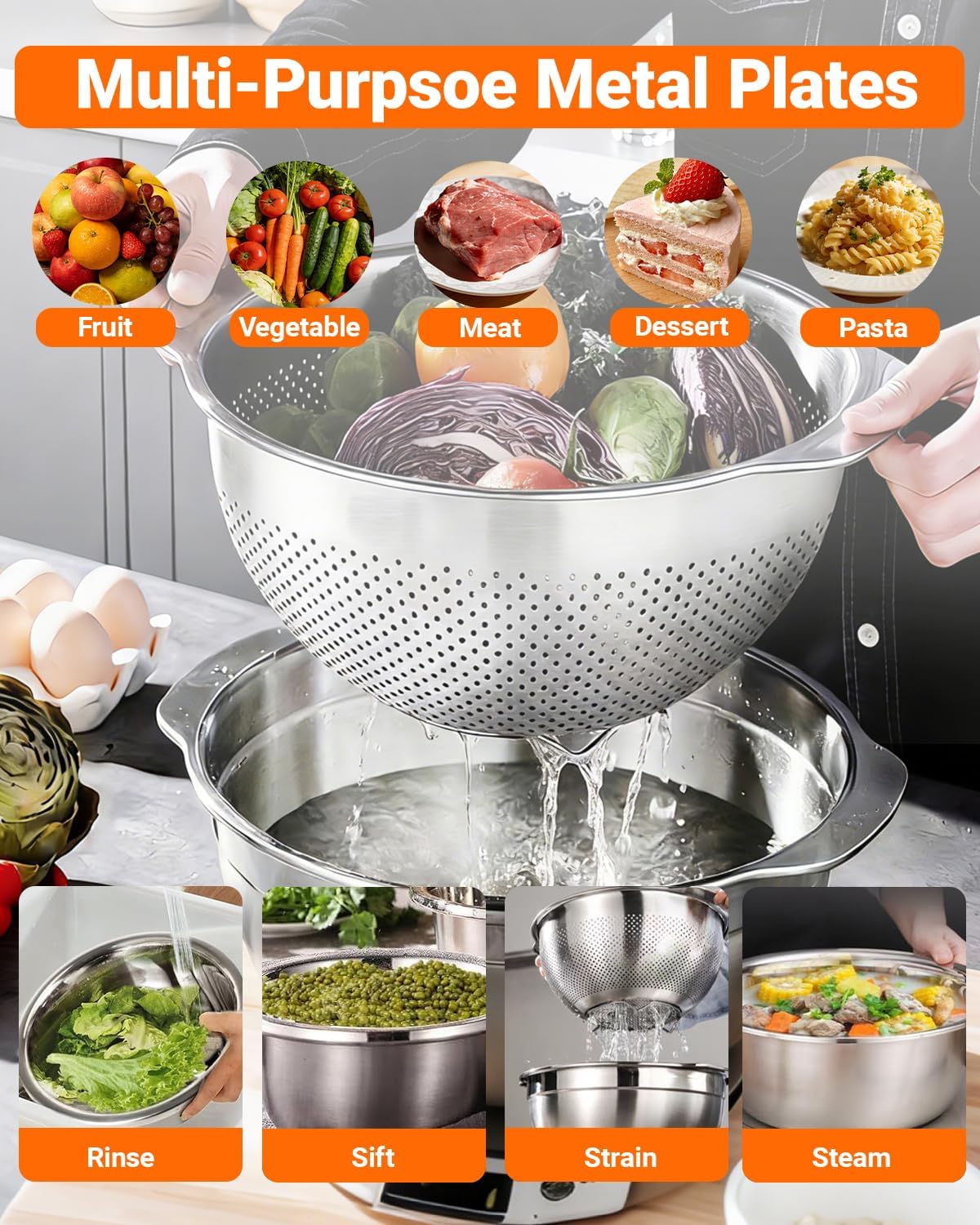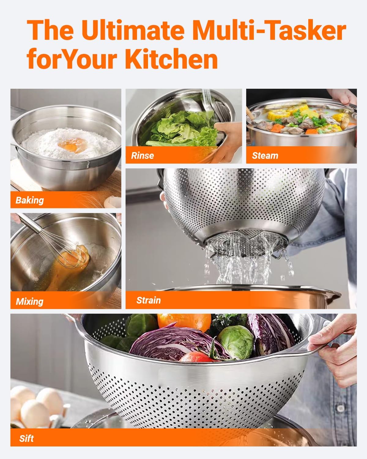 Premium Stainless Steel Colander & Mixing Bowl Set for Daily Kitchen Use This stainless steel colander and bowl set includes two practical sizes: 3QT and 5QT, designed to handle a wide range of kitchen tasks. Each size features a solid mixing bowl paired with a matching strainer basket, allowing you to wash, soak, drain, and mix food efficiently in one complete system. The fine draining holes make it easy to rinse rice, strain pasta, wash fruits and vegetables, or drain cooked foods without losing small ingredients. Crafted from durable stainless steel, these metal bowls resist rust, odors, and stains, making them a reliable addition to any kitchen. Whether you’re preparing meals, cleaning produce, or handling everyday cooking tasks, this colander and strainer bowl set offers the ideal balance of capacity, durability, and convenience. A must-have kitchen tool set for home cooks who value efficiency and clean results.