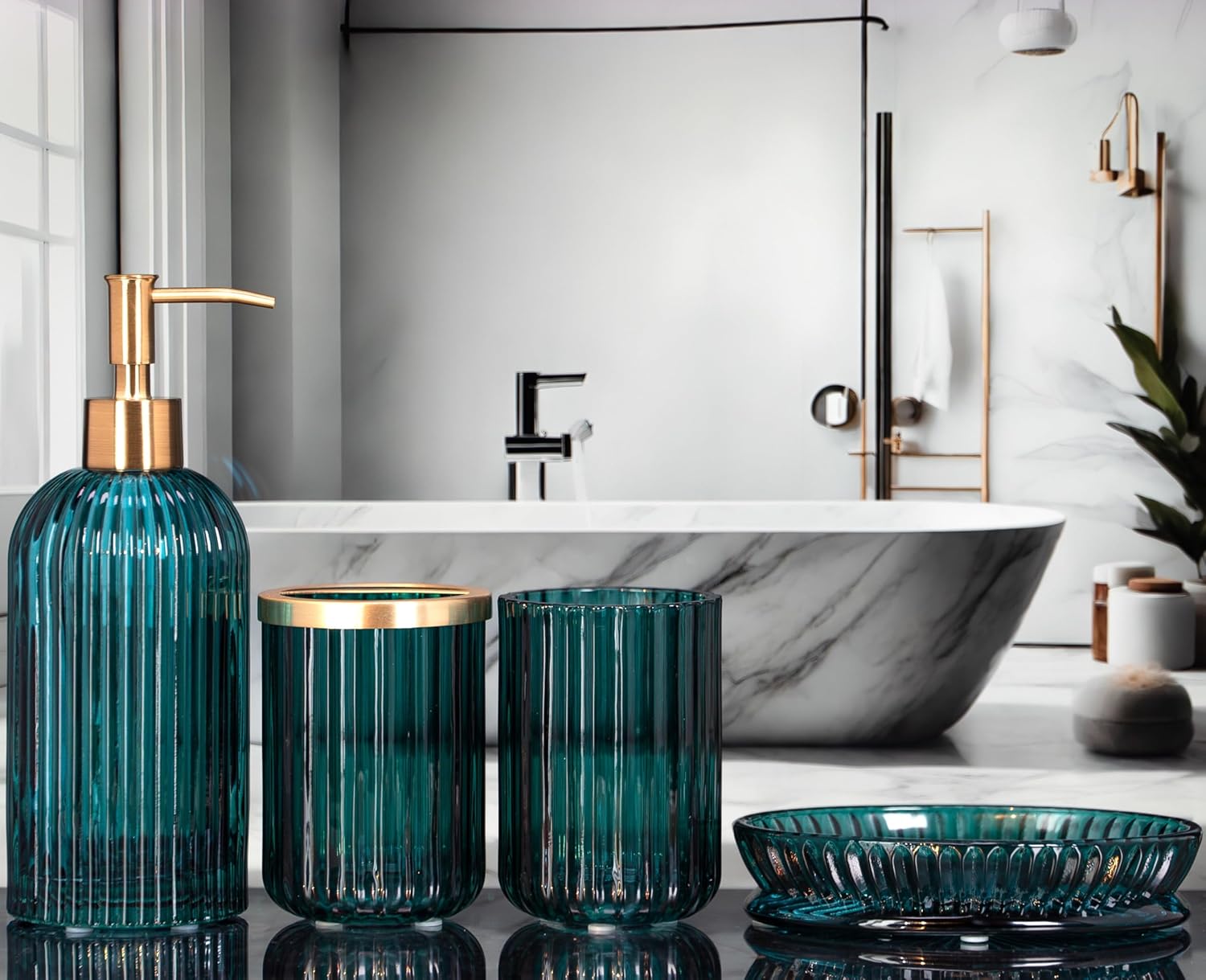 Stellar Homeware 4 Piece Heavy Weight Patterned Glass Brushed Gold Metal Luxury Bathroom Accessory Set with Lotion Dispenser, Toothbrush Holder, Tumbler & Soap Dish | Modern Decor Gift