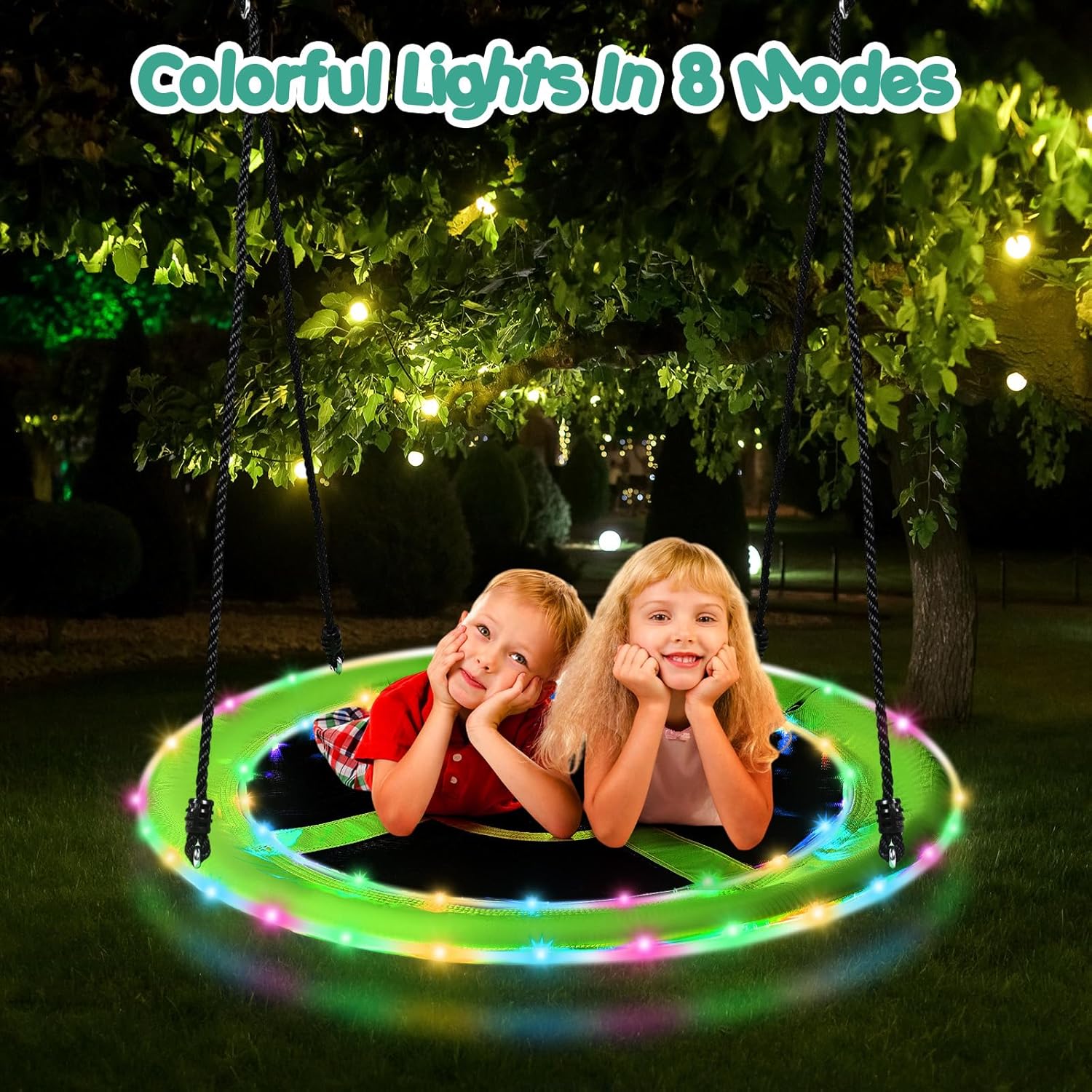Features: This outdoor tree swing, with its vibrant main green color, boasts a diameter of approximately 40 inches. The t feature is the circle swing, which is elegantly crafted from durable 900D Oxford cloth. Despite its many features, installation of this outdoor swing set remains straightforward and easy, thanks to the inclusion of necessary tools and comprehensive installation instructions. Specifications: Material: 900D Oxford cloth, steel frame Color: main green Size: approx. 40 inches in diameter Package includes: 1 x Swing set Notes: Manual measurement, please allow slight errors on size. The color may exist a slight difference due to different screen displays. Small parts included, please keep them away from little kids to avoid swallowing risk. Suitable for people over 12/14 years old, and it's recommended to use under the supervision of adults in case of choking risk.