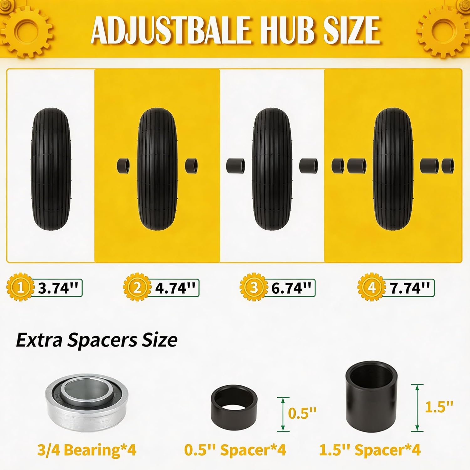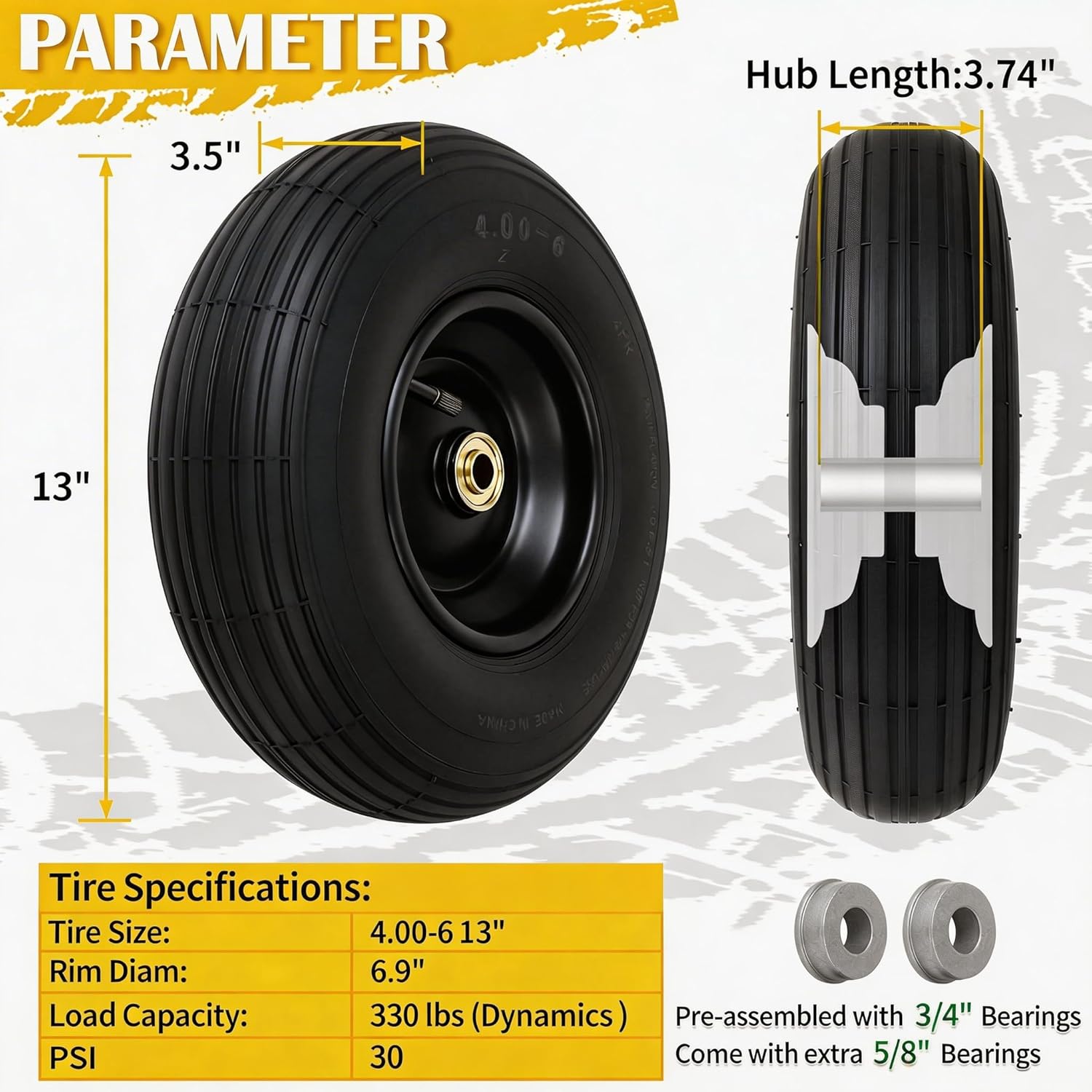 Tackle Any Task with Confidence: Premium 4.00-6 Pneumatic Tire & Wheel Set (2-Pack) Are you tired of flimsy tires that can't handle the load, constantly go flat, or rust after a single season? Upgrade your equipment with our heavy-duty 4.00-6 Pneumatic Tire and Wheel Set, engineered for superior performance, durability, and versatility. Designed for the toughest jobs, this 2-pack provides the reliable support and traction you need for all your hauling demands. Unmatched Strength & Universal Adaptability: High Load Capacity & Universal Fit: Each 13-inch 4.00-6 pneumatic tire is built to support an impressive 330 lbs, providing a combined capacity of 660 lbs per pair. This makes them perfectly suited for heavy-duty tasks involving wheelbarrows, garden carts, hand trucks, and utility trailers. Effortlessly transport tools, soil, construction materials, and more. Seamless Compatibility with Adjustable Hub: Say goodbye to compatibility headaches! Our tires come with both 5/8” and 3/4” bearings and feature an innovative adjustable centered hub. With the included 8 nylon spacers (4x 0.5” and 4x 1.5”), you can easily customize hub lengths from 3.74” to 7.74”. This ensures a perfect fit for a wide range of equipment, including popular brands like G orilla Carts, dolly carts, Toro, and John Dee re wheelbarrows. Engineered for Extreme Durability & Performance: Upgraded Durability & Superior Traction: Navigate challenging terrains with ease. The reinforced polyurethane tread boasts a ribbed design, providing exceptional puncture resistance and superior grip on gravel, mud, and slopes. Integrated shock-absorbing steel rims work to reduce vibrations, ensuring a smoother, more comfortable pushing experience. Anti-Flat & Explosion-Proof Reliability: Focus on your work, not on tire maintenance. Our tires feature a thickened inner tube and an airtight seal to effectively prevent flats and blowouts. Made with carbon-reinforced rubber that meets strict EPA standards, these tires are free from toxic odors, ensuring safe use in gardens and for operators. No More Wobbling or Rust: Experience unmatched stability and longevity. Precision-machined steel bearings significantly reduce wobbling, providing a stable and controlled ride. Furthermore, weather-resistant coatings offer robust protection against corrosion, making these tires ideal for year-round use in any condition – be it snow, rain, or rocky terrain. Invest in a tire solution that works as hard as you do. Choose our 4.00-6 Pneumatic Tire & Wheel Set for reliable, long-lasting performance.