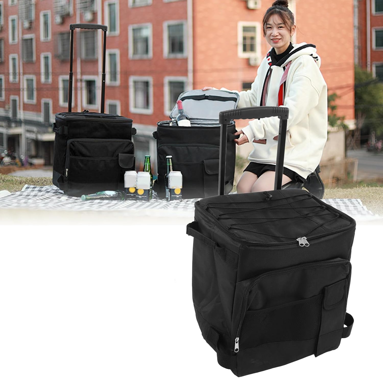 1. 43l large capacity: The refrigerated bag has a capacity of 43l and can accommodate various items, such as food, beverages, snacks, beer, etc.2. Dual portable rolling cooler adopts a dual design, making it easy to open and close the bag to prevent items from falling.3. Portable design: The detachable hook makes the refrigerated bag easy to carry, and the double handles make it easy to move, suitable for indoor and outdoor use.4. Oxford cloth material: The cooling bag is made of oxford cloth and aluminum foil, and leakage proof, preventing rainwater and dust from entering.5. Applicable scenario: This pull rod insulation bag is suitable for outdoor camping, fishing, picnics, beach vacations, boating, supermarket shopping, etc.specification:item type: Large rolling coolerproduct material: Oxford cloth, aluminum foilcapacity: 43lpackagelist:1 x cooler1 x bottom rod