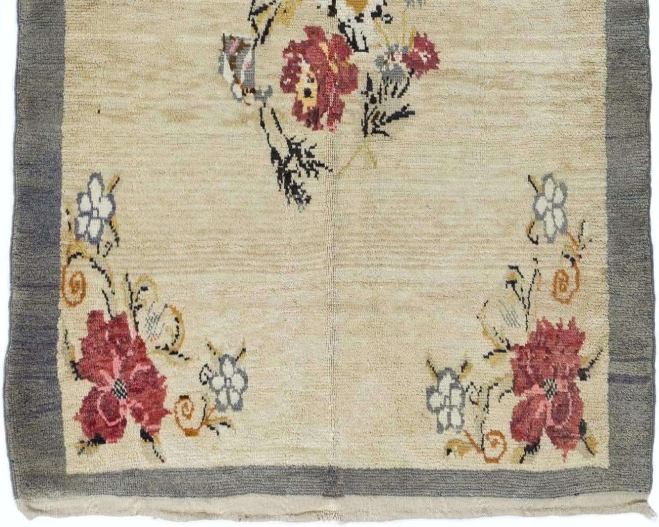 A vintage hand-knotted rug from Central Turkey, made of velvety lamb's wool, featuring large floral motifs in red, white, gray and tawny brown at its center and corners, against a plain, ivory background and a solid border in gray. The rug was hand-knotted with medium soft wool pile. It is in very good, sturdy and professionally cleaned. Size: 4.6 x 7.3 Ft (140 x 220 cm) Materials: Wool Ref No: KEF44