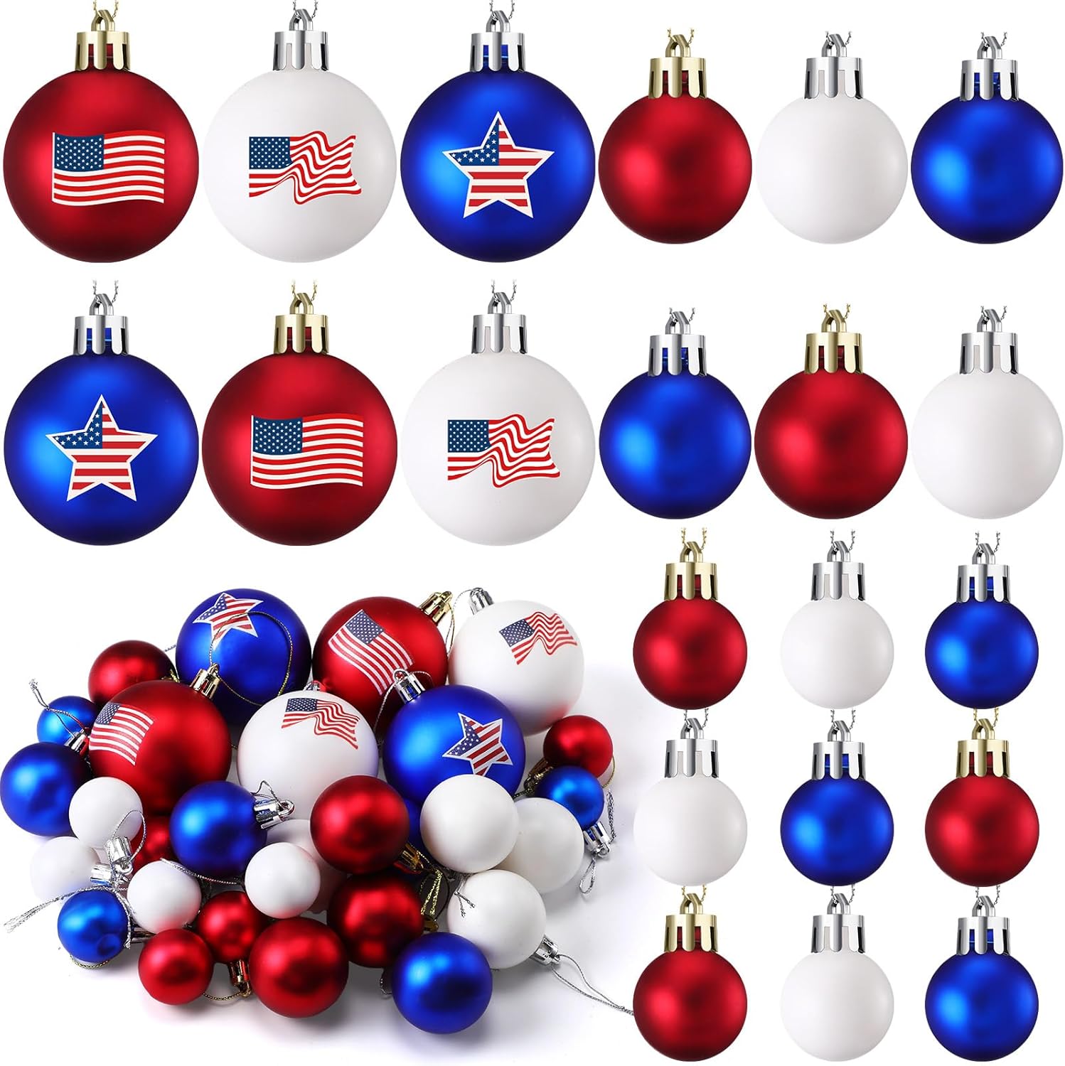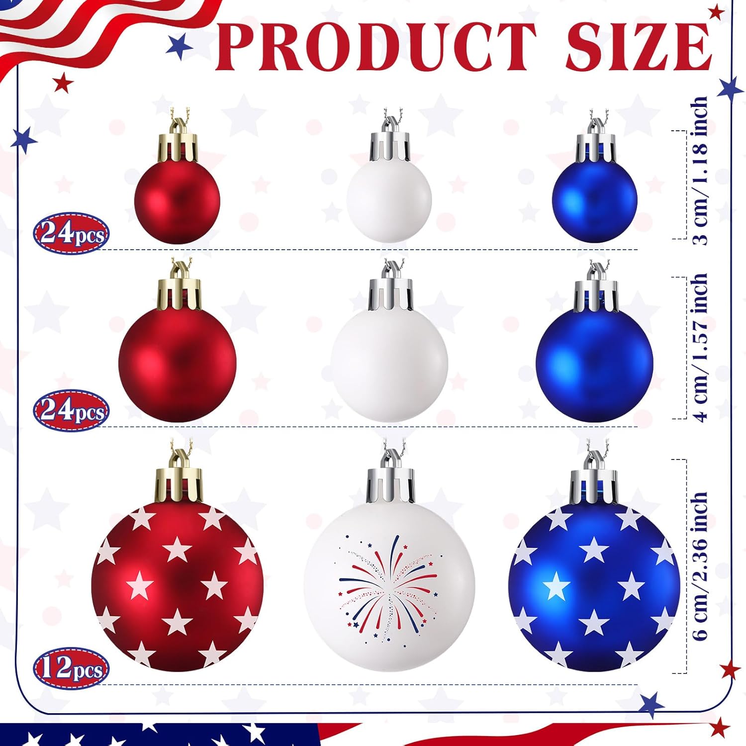 Features: Each memorial day ornament comes with a pre attached rope for easy hanging. These pieces make ideal tree decorations and are ideal for adorning fireplaces, windows, door handles, and more. Specifications: Material: plastic Color: red, white, blue Size: 3cm, 4cm, 6cm Package includes: 60 Pcs x 4th of July ornament ball Notes: Manual measurement, please allow slight errors on size. The color may exist a slight difference due to different screen displays.