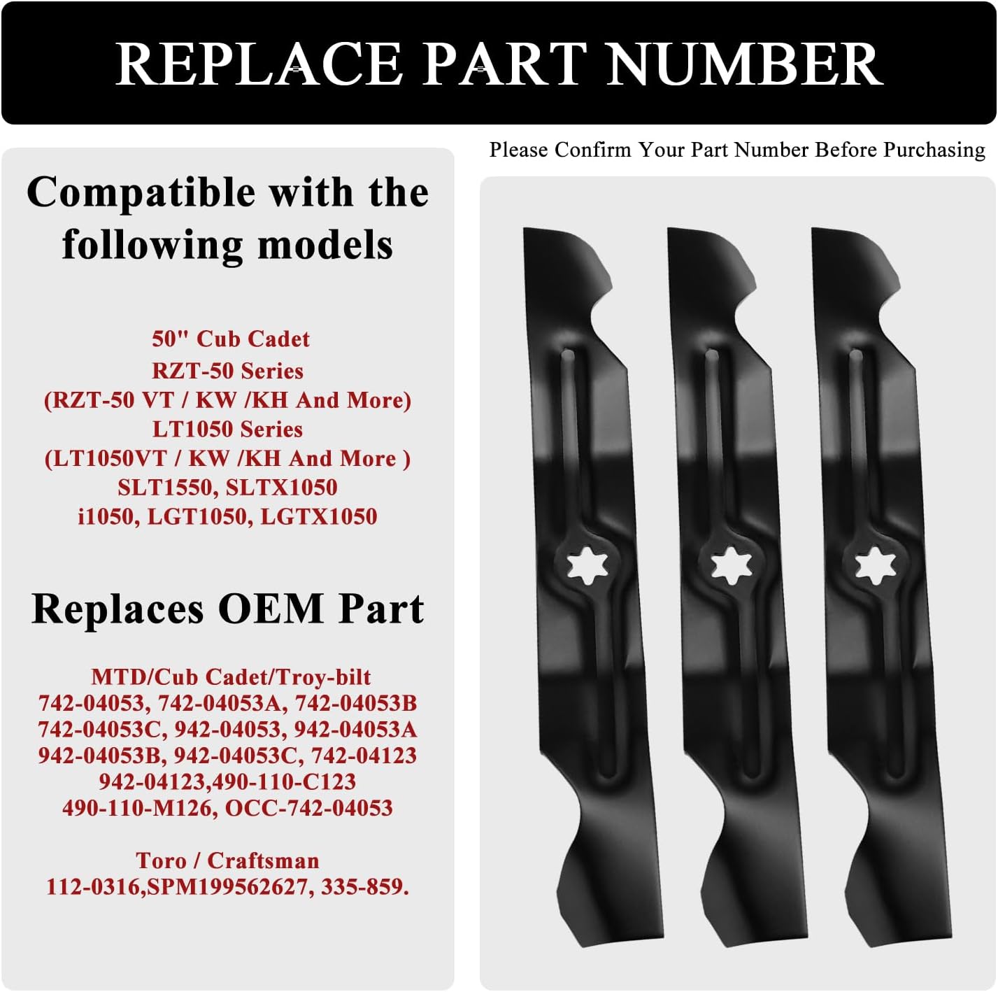 7/942-04053 3PK Mower Blades Replace 7/942-04123 7/942-04053C 490-110-C123 Compatible with 50" Cub Cadet RZT-50 LTX1050 LT1550