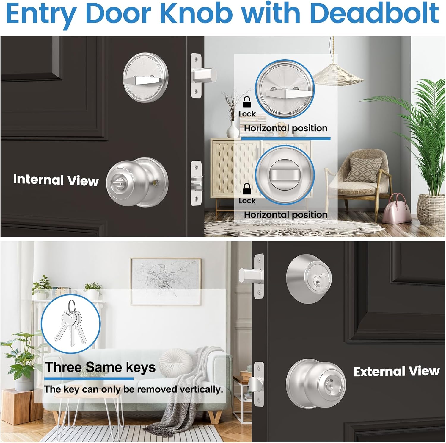 | Included Components | Single Cylinder Deadbolt, Door Knob Sets, Deadbolt Latch, Knob Latch, Same keys*3, Mounting Screws, Strike Plates, Strike Box, Mounting Instructions |