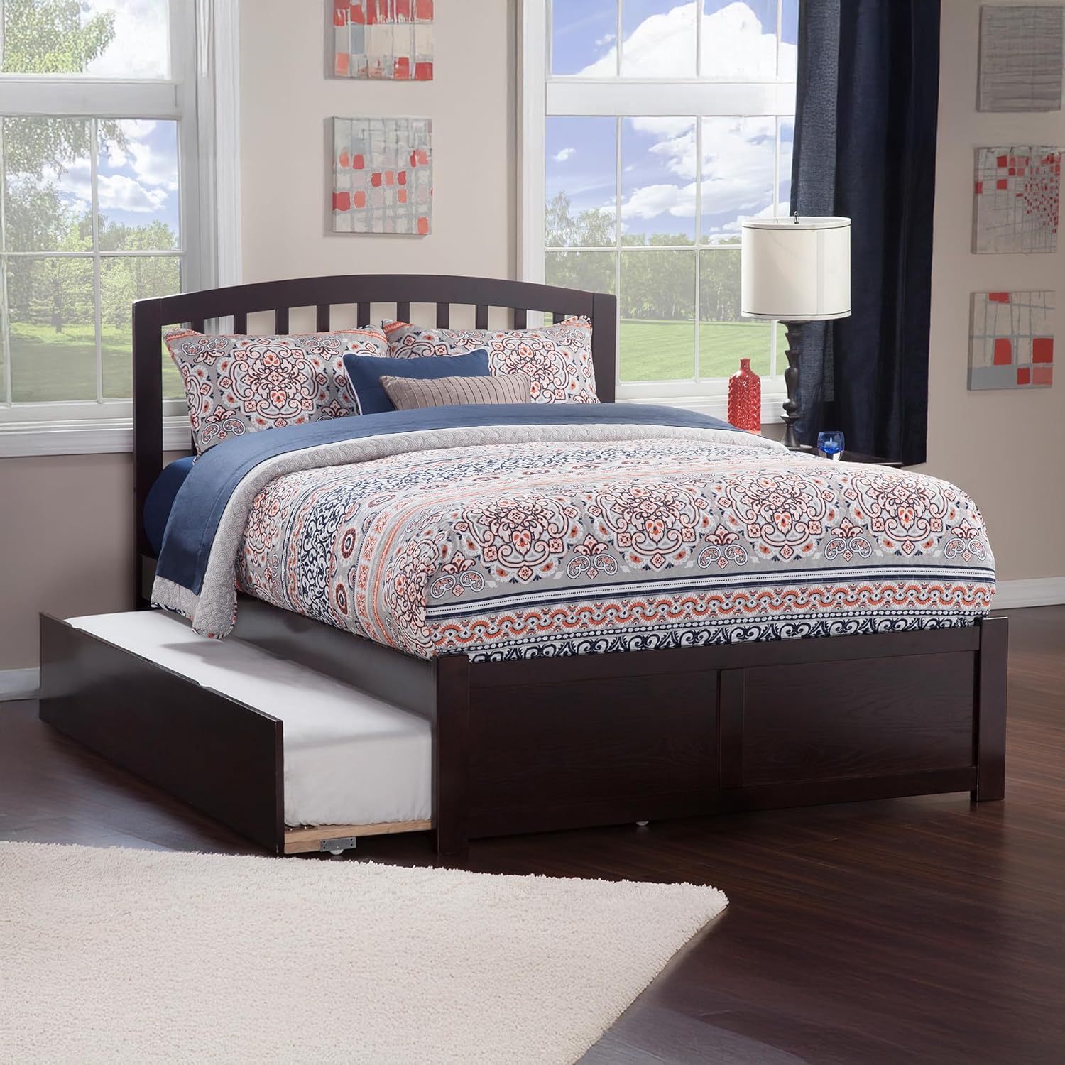 Bring timeless sophistication to your bedroom with the Richmond Solid Wood Platform Bed with Footboard and Trundle. Blending classic craftsmanship with modern comfort, the Richmond features a smooth, arched headboard with Mission-inspired slats for a look that’s both warm and refined. Built from solid hardwood and veneers, this bed delivers exceptional durability and style. The trundle, neatly tucked beneath the frame, glides out easily from either side to provide extra sleeping space for guests. With a supportive slat system, the Richmond is mattress-ready and does not require a box spring or foundation. Available in Espresso, White, Walnut, Grey, and Light Toffee finishes and in Twin XL, Twin, Full, Queen, and King sizes, this bed offers the perfect fit for any room.