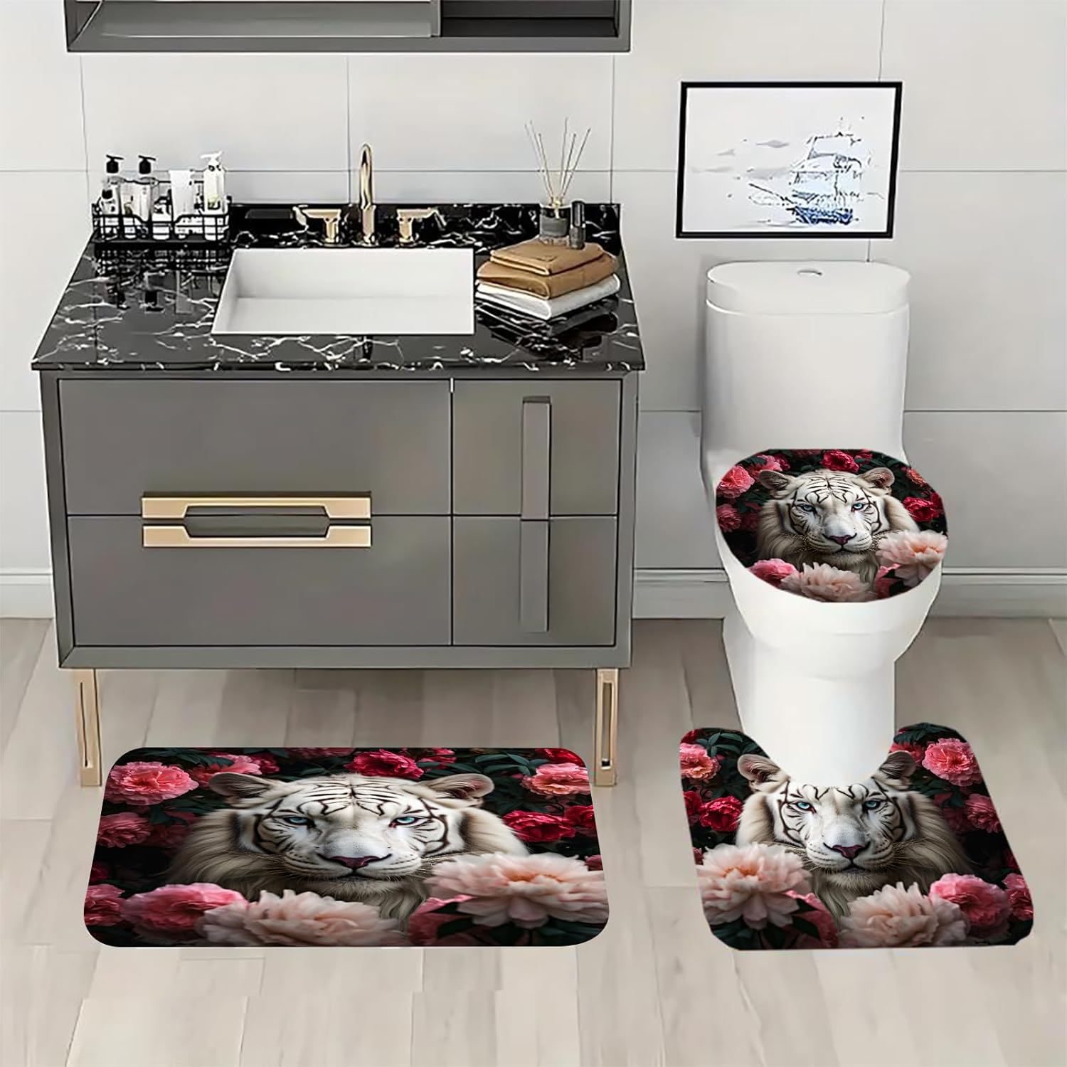 Our 4 piece bathroom set - Bathroom mat, stylish shower curtain, comfortable toilet lid cover - Can easily match your bathroom style!Feature:1. Material - Shower curtain is made of polyester fabric, which is waterproof. Bathroom mat and rug: Thickened memory foam + flannel surface, soft and more comfortable2. Pattern Printing - Our bathroom decor set are printed with HD pattern printing technology, colorfast, friendly and reliable. It can make the bathroom more lively and interesting.3. Private - Shower curtain protect your privacy, anti-dust, easy to hang.4. Easy to Install - The shower curtain comes with 12 hooks, allowing the shower curtain to slide freely and smoothly. The non-slip mat and shower mat has a bottom dotting non-slip design to ensure safety while stepping in and out of the shower.5. Washing Method - Hand wash or machine wash in cold water, hang to dry, do not bleach.Product Size: Shower curtain measures 72 in x 72 in, Bathroom mat measures 29.1 in x 17.5 in, Toilet Lid Cover measures 17.7 in x 13.4 in, U shape rug measures17.3 in x 14 in,U-shaped and toilet lid cover mats, Fits most bathroom toilets.Package Including:1 × Shower Curtain1 × Bathroom Mat1 × Toilet Cover1 × U-shaped Rug12 × Plastic Hooks1 × Product ManualAttention Please:Shower curtains and rugs will have creases during shipping. The shower curtain will be more beautiful after ironing, the creases of the carpet will disappear after soaking in water for a while, and will disappear when you take it out and unfold it.