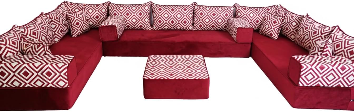 Bring elegance and comfort to your home with our Traditional Arabic Majlis Floor Sofa Set. Perfectly designed for floor seating, our handmade sofas embody the timeless beauty of Arabic furniture. Inspired by classic jalsa and majlis seating styles, this versatile floor couch offers a cozy and luxurious addition to your living room or lounge. The high-quality craftsmanship and luxurious cushions ensure comfort and durability, while the traditional Arabic design adds a cultural touch to any space.Please Note: You will receive the exact configuration and cushion thickness of the variant you select from the listing page.What’s Included in Your Set?If you choose 'U Sofa + Ottoman + Pillows' you will get these:-3 Floor Seating Cushions (190 x 70 cm / 75 x 27 inch)-11 Backrest Pillows (70 x 50 cm / 27 x 20 inch)-3 Pouf Pillows (70 x 50 cm / 27 x 20 inch)-4 Armrest Pillows (50 x 20 x 20 cm / 20 x 8 x 8 inch)-4 Small Pillows (40 x 40 cm / 16 x 16 inch)-1 Ottoman Couch (60 x 60 x 20 cm / 24 x 24 x 8 inch)This sofa set comes in 26 separate pieces.If you choose 'U Sofa + Ottoman' you will get these:-3 Floor Seating Cushions (190 x 70 cm / 75 x 27 inch)-11 Backrest Pillows (70 x 50 cm / 27 x 20 inch)-4 Armrest Pillows (50 x 20 x 20 cm / 20 x 8 x 8 inch)-4 Small Pillows (40 x 40 cm / 16 x 16 inch)-1 Ottoman Couch (60 x 60 x 20 cm / 24 x 24 x 8 inch)This sofa set comes in 23 separate pieces.If you choose 'U Sofa Only' you will get these:-3 Floor Seating Cushions (190 x 70 cm / 75 x 27 inch)-11 Backrest Pillows (70 x 50 cm / 27 x 20 inch)-4 Armrest Pillows (50 x 20 x 20 cm / 20 x 8 x 8 inch)-4 Small Pillows (40 x 40 cm / 16 x 16 inch)This sofa set comes in 22 separate pieces.The thickness of the FLOOR SEATING CUSHIONS will be based on the variant you choose from the listing page: 4" Thickness (10 cm) or 8" Thickness (20 cm)