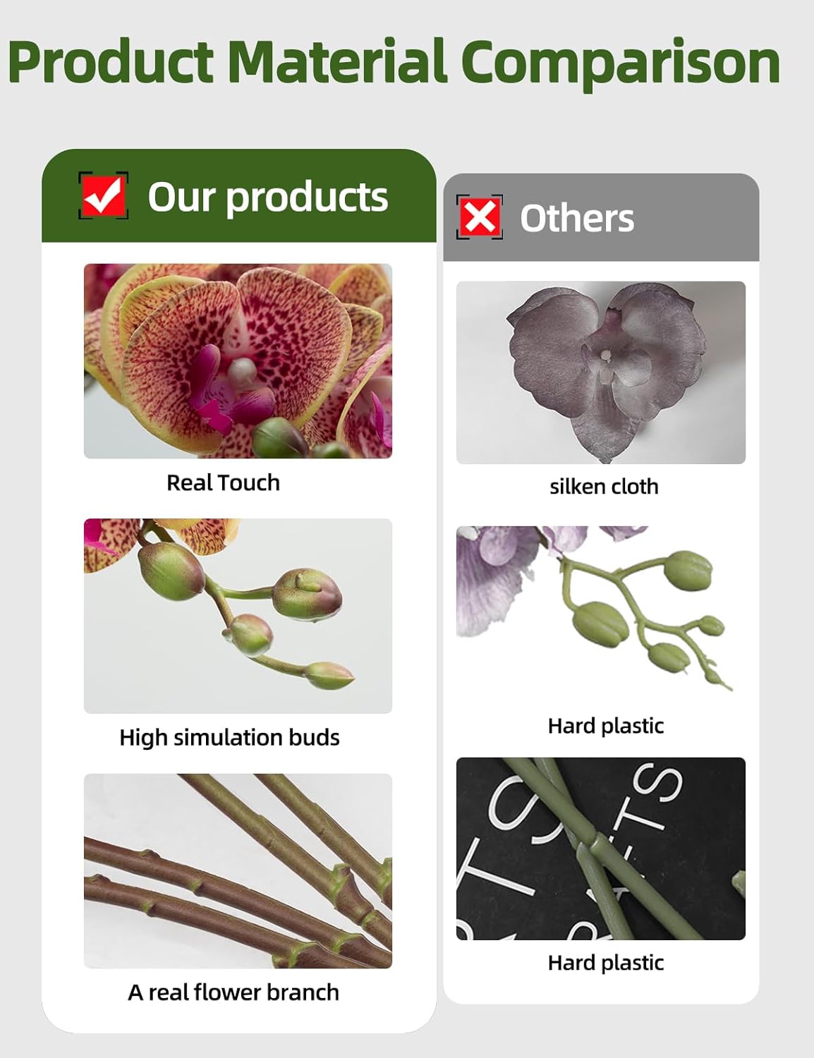 【Touch Orchid Flowers】Made with Made of silk and latex on both sides of each petal and leaf, our Artificial Orchid flowers are softer, and more realistic than ordinary silk or plastic flowers. Artificial Orchid flowers has not only a truly realistic look,Lifelike textures on petals and leaves