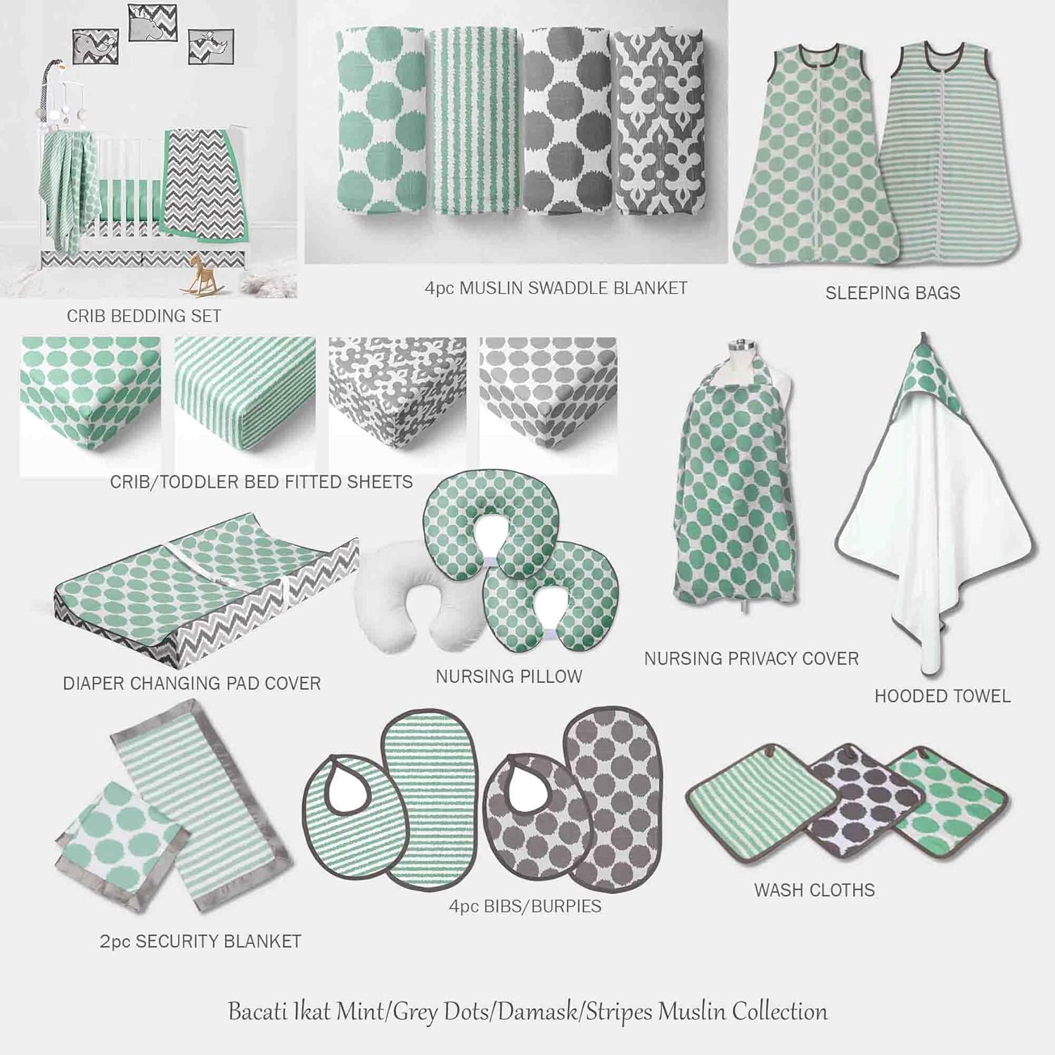 Wrap your baby in warmth with this super soft Bacati Ikat Mint Stripes 2 pcs Muslin Crib Sheet, Size: 52 x 27.5 x 7". It is made with 100% cotton muslin fabric. It is machine washable and gets softer with every wash. It coordinates with the rest of Bacati Ikat Bedding Collection.See the entire rest of Bacati Ikat Collection for endless Mix N match possibilities. Cotton is a green fabric as it is renewable resource & biodegradable. Cotton is breathable making it more comfortable in extreme climates. Cotton is inherently soft delicate on skin of babies, durable & user friendly. Cottons gentle quality makes it appropriate for Babies with very sensitive skin or skin allergies.