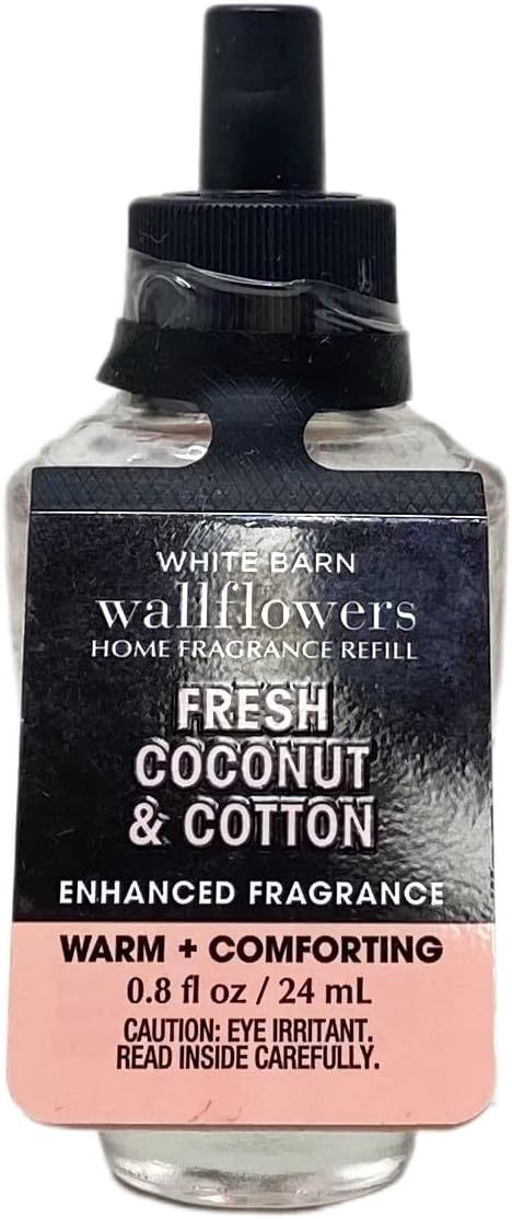 Bath & Body Works Fresh Coconut & Cotton Wallflowers Home Fragrance Refills Set Includes 2 Wallflowers Home Fragrance Refills (0.8 fl oz / 24 mL each). What it smells like: laundry day on the islands. Fragrance notes: coconut, coastal breeze and beachside cotton. What it does: fills any room with noticeable, always-on fragrance. New enhanced fragrance. Made with natural essential oils. Lasts up to 30 days. Effortless fragrance that welcomes you home. Pairs with any Wallflowers fragrance plug (sold separately)