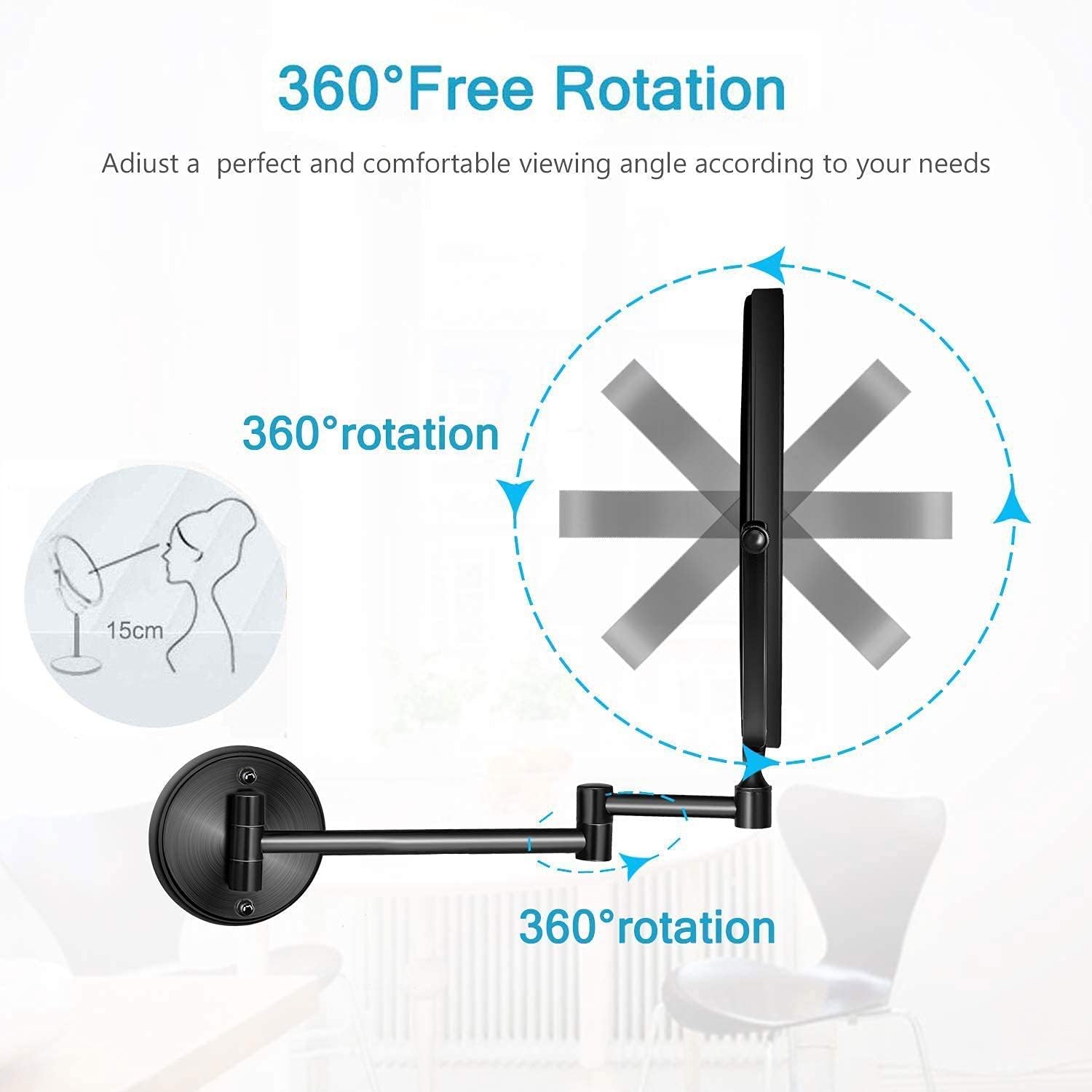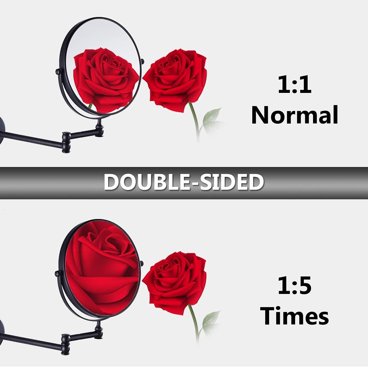 【 Magnify Your Beauty】: Study shows women love looking in the mirror will be more confident and beautiful, help with self-affirmation, appearance and temperament can be greatly improved. wall- mounted vanity mirror, 5x or 1x magnification to switch freely, beauty changes from the care of the details. Features: Color: Matte Black Diameter: 8 inches - Double- sided round mirror: 5x magnifying mirror+ ordinary - The arm can be extended to 12 inches - Material: Brass+ 304Stainless Steel - Rotation angle: 360 degrees - extendable shaving mirror- - fixed on the wall: yes - double sided: yes - Applicable gifts: Female- Occasion: bathroom, bedrppm, hotel, spa, etc. - Installation: with drilling ( with screws) The package includes: 1x wall- mounted bathroom mirror 1x pack of fixing screws ★ Service- Our store operates in good faith and takes customer satisfaction as its purpose. We believe that you are satisfied with the quality and excellence of our products. If you have any questions, please feel free to contact us. We provide you with a satisfactory solution