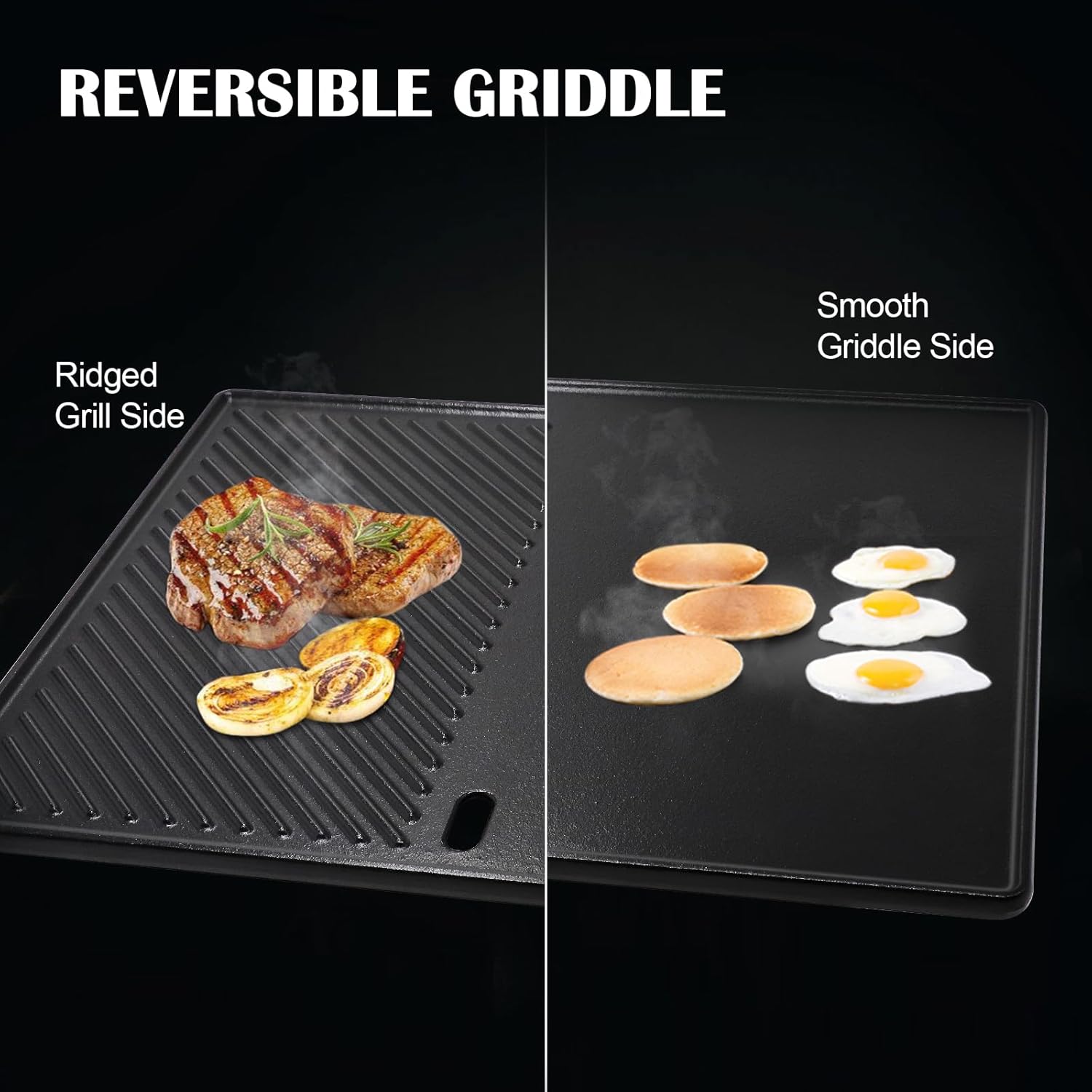 - ► 2-In-1 Griddle Pan - The smooth side is perfect for making grilled cheese sandwich, eggs and pancakes. The ribbed side is very suitable for grilling foods such as steak, fish, chicken and hamburger. ► Long-Lasting Cast Iron - Made of heavy duty Cast Iron. It is an iron alloy with 2 to 4% carbon. This material is popular for cookware because of its durability, versatility, and heat retention capability. A cast iron griddle, therefore, is a heavy-duty cooking surface.