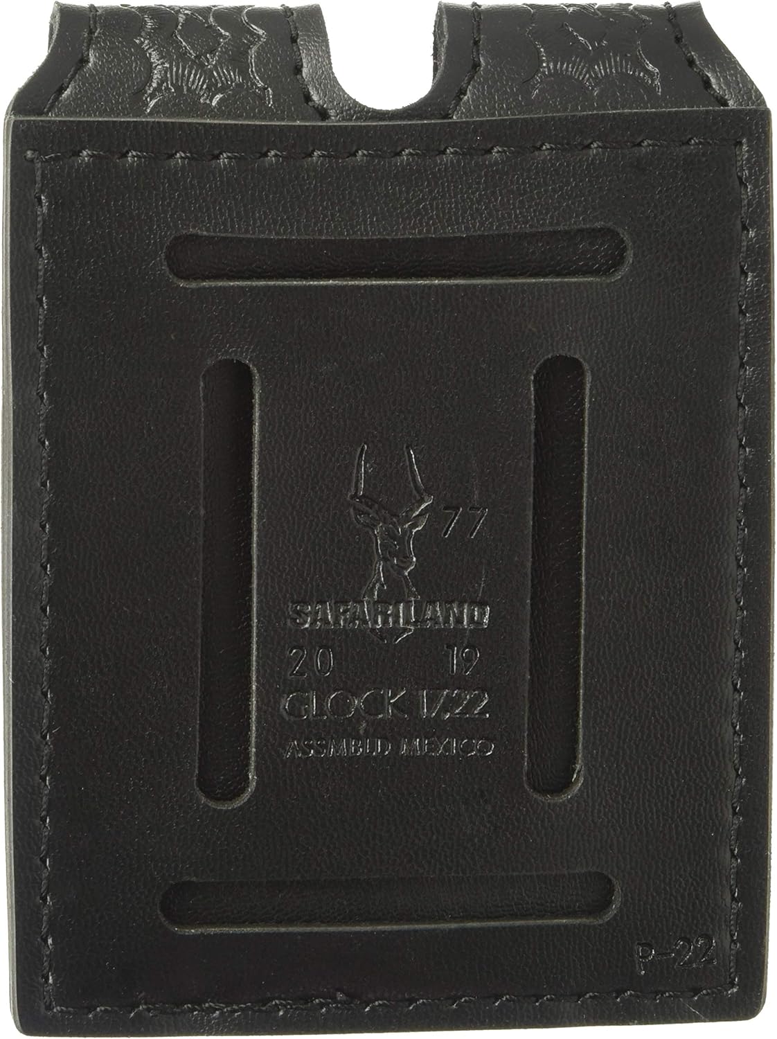 The Model 77 Double Magazine Pouch is designed to carry two magazines on a 2.25" (58mm) duty belt. The 77 features both vertical and horizontal belt slots, allowing it to ride in either a vertical or low-profile horizontal position. A magazine tension screw located between the two pouches allows for easy retention adjustment. It's constructed of rugged SafariLaminate and is available in several scuff-resistant finishes with four different closures.