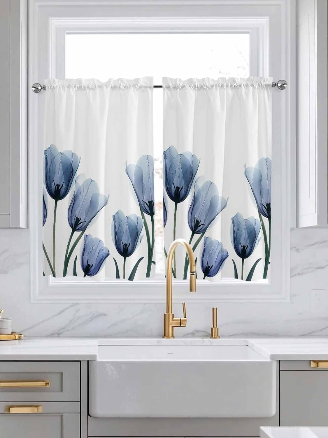 Rod Pocket Design, 2 Panels Flexible, Light-Filtering and Breathable, Elegant Blue Tulip Tier Curtains Create an Ideal Room for YouDo you want to add a warm atmosphere to your home?Do you want a curtain that combines elegant appearance with practical functions?Are you looking for a high-quality curtain that is easy to install and clean?2 Panel polyester Half Window Tier Curtains are the ideal choice to meet your needs.SpecificationsMaterial: Polyester PongeeSize: 27.5"Wx24"L Package Including: 2 Panels Tier Curtain, comes with 1" and 3" rod pocket2 Panels Tier Curtains- Small tier curtain over sink not only provides a wider coverage area, but also allows you to freely adjust the placement of curtains according to time and needs. When you need more sunlight, you can open one curtain; when you need complete light blocking, you can stack two curtains, bedroom tier curtains to meet the needs of different rooms and window types.Light Balance- Bathroom tier curtains strike an ideal balance between light and privacy. The cortinas de niveles can filter out strong sunlight, allowing natural light to enter the room in a soft way, while blocking the outside world's sight, providing you with a comfortable and private living space. Whether you want to enjoy a quiet afternoon or a good night's sleep, this elegant window curtain can meet your needs.Versatile Curtains- Our half curtains for living room can be used not only as curtains, but also for other purposes, such as shower curtains, room dividers, decorative backgrounds, wardrobe dust covers, heat insulation curtains, picnic mats, etc.Ideal Gifts- Giving small cafe curtains as gifts on special holidays, such as housewarming, weddings, opening gifts, Christmas, Thanksgiving or Mother's Day gifts, is both practical and conveys care and blessings.