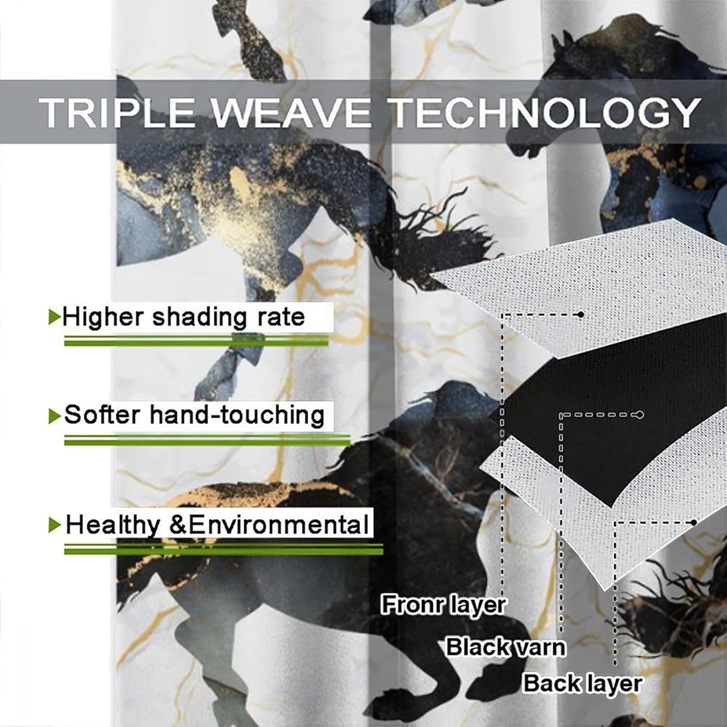 brebasf Abstract Wildlife Horses Silhouette Patterned Blackout Curtains Comes in eight sizes: Total size: 45" L × 42" W (114cm × 107cm),Includes two pieces, each of which measures:45" length × 21" width (114cm × 53.5cm). Total size: 54" L × 42" W (137cm × 107cm),Includes two pieces, each of which measures:54" length × 21" width (68.5cm × 53.5cm). Total size: 63" L × 42" W (160cm × 107cm),Includes two pieces, each of which measures:63" length × 21" width (160cm × 53.5cm). Total size: 63" L × 55" W (160cm × 140cm),Includes two pieces, each of which measures:63" length × 27.5" width (160cm × 70cm). Total size: 63" L × 63" W (160cm × 160cm),Includes two pieces, each of which measures:63" length × 31.5" width (160cm × 80cm). Total size: 72" L × 63" W (183cm × 160cm),Includes two pieces, each of which measures:72" length × 31.5" width (183cm × 80cm). Total size: 63" L × 72" W (160cm × 183cm),Includes two pieces, each of which measures:63" length × 36" width (160cm × 91.5cm). Total size: 84" L × 84" W (214cm × 214cm),Includes two pieces, each of which measures:84" length × 42" width (214cm × 107cm). This Modern Luxury Marble Background Running Horse Curtains liven up your indoor or outdoor spaces with a sense of airiness and beauty.Function: 1. Made of durable polyester fiber,soft and light. 2 The package includes: 2 panels. Curtain material: 98% polyester fiber. Provide a beautiful appearance for your bedroom,living room or office. 3. The curtains are grommet,which can be used with any standard curtain rods. Our products can be used as living,room curtains. Mother's Day,Christmas,Halloween,Thanksgiving,New Year's party decorations at home! We believe that you will like this curtain as much as we do. If you are not satisfied with our products,please contact us,we will solve any problems encountered by the products for you,so that you are satisf