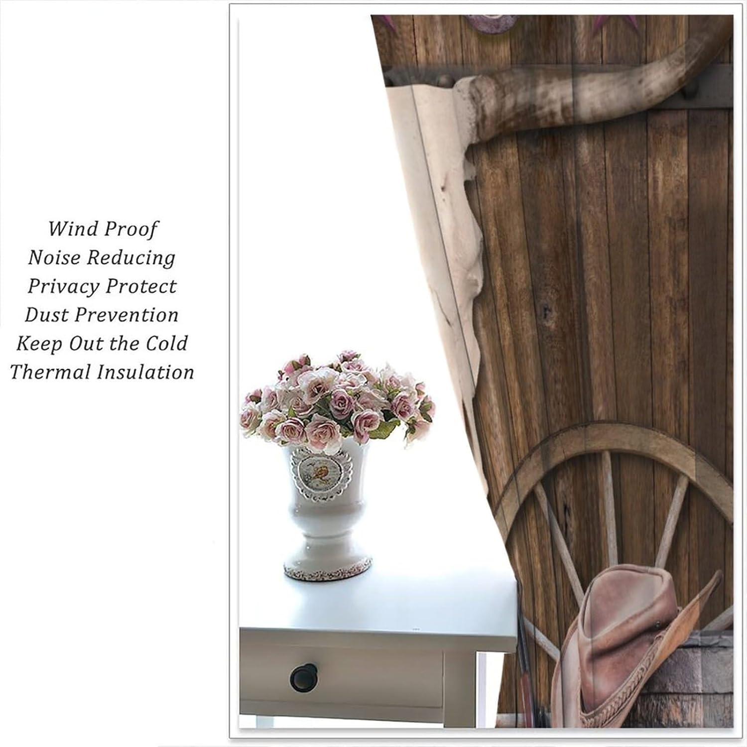brebasf Retro Western Cow Skull Patterned Blackout Curtains Comes in eight sizes: Total size: 45" L × 42" W (114cm × 107cm),Includes two pieces, each of which measures:45" length × 21" width (114cm × 53.5cm). Total size: 54" L × 42" W (137cm × 107cm),Includes two pieces, each of which measures:54" length × 21" width (68.5cm × 53.5cm). Total size: 63" L × 42" W (160cm × 107cm),Includes two pieces, each of which measures:63" length × 21" width (160cm × 53.5cm). Total size: 63" L × 55" W (160cm × 140cm),Includes two pieces, each of which measures:63" length × 27.5" width (160cm × 70cm). Total size: 63" L × 63" W (160cm × 160cm),Includes two pieces, each of which measures:63" length × 31.5" width (160cm × 80cm). Total size: 72" L × 63" W (183cm × 160cm),Includes two pieces, each of which measures:72" length × 31.5" width (183cm × 80cm). Total size: 63" L × 72" W (160cm × 183cm),Includes two pieces, each of which measures:63" length × 36" width (160cm × 91.5cm). Total size: 84" L × 84" W (214cm × 214cm),Includes two pieces, each of which measures:84" length × 42" width (214cm × 107cm). This Rustic Country Wooden Board Cowboy Boots Wheel Texas Star Print Curtains liven up your indoor or outdoor spaces with a sense of airiness and beauty.Function: 1. Made of durable polyester fiber,soft and light. 2 The package includes: 2 panels. Curtain material: 98% polyester fiber. Provide a beautiful appearance for your bedroom,living room or office. 3. The curtains are grommet,which can be used with any standard curtain rods. Our products can be used as living,room curtains. Mother's Day,Christmas,Halloween,Thanksgiving,New Year's party decorations at home! We believe that you will like this curtain as much as we do. If you are not satisfied with our products,please contact us,we will solve any problems encountered by the products for you,so that you are satisf