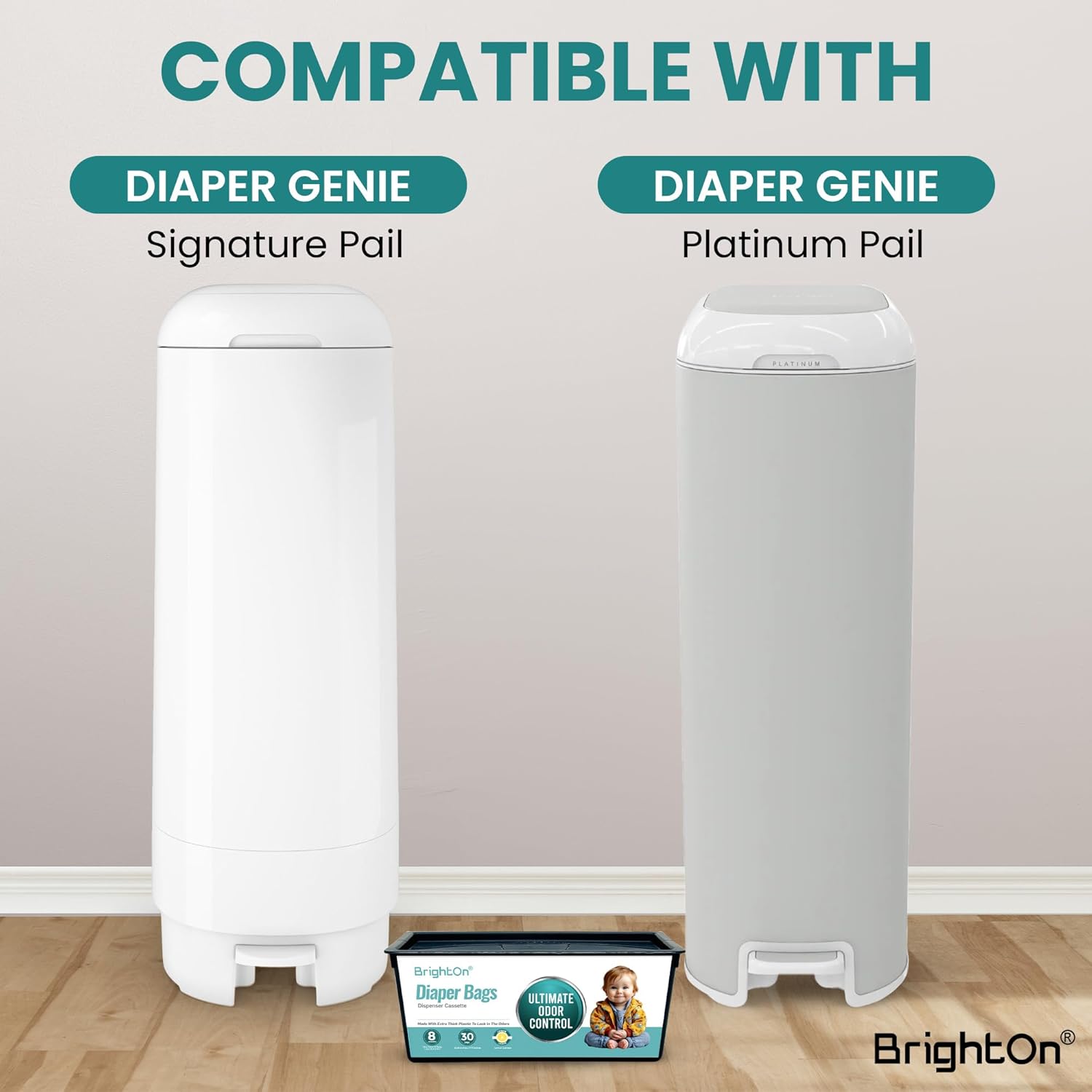 COMPATIBILITY: BrightOn bags are specifically designed to be compatible with Diaper Genie Easy Roll Bags, ensuring compatibility with both the Diaper Genie Signature Pail and compatibility with the Diaper Genie Platinum Pail. Disclaimer Compatible with Diaper Genie which is a registered trademark. This product is not manufactured by, sponsored by, or endorsed by the owner of the Genie brand. References are made solely to indicate that this product is designed to work with that system.