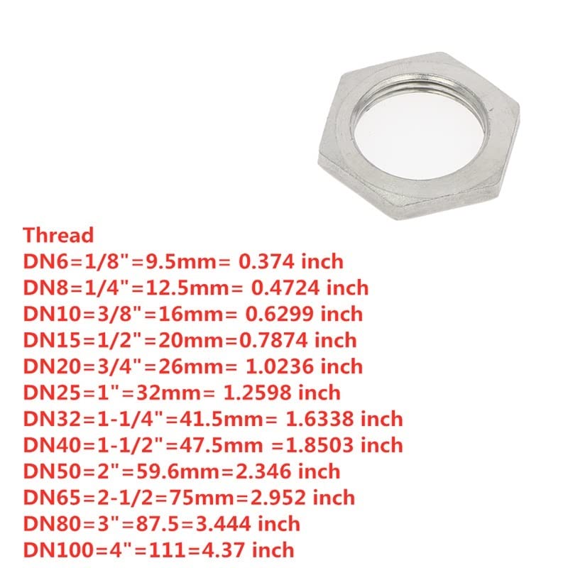 304 Stainless Steel Hex Nuts, 1/4", 3/8", 1/2", 3/4", 1", 1-1/4", BSP Connection: Female Type: Coupling Technics: Forged Model Number: SS304 Material: 304 stainless steel Operating pressure: 1 Mpa 143 PSI Package include:1PC
