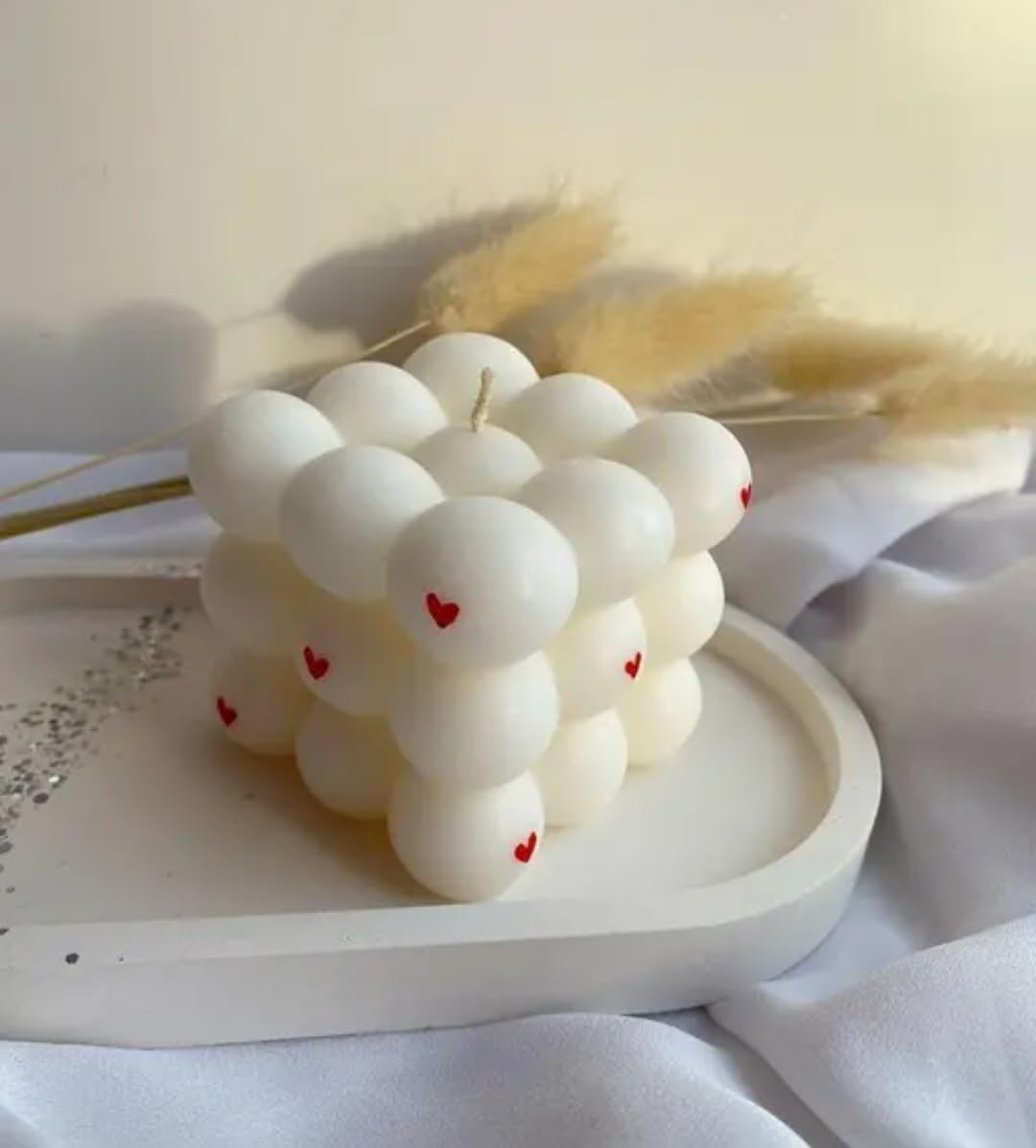 Add a touch of whimsy and romance to any space with these charming bubble candles adorned with delicate red heart accents. Each candle features a unique three-dimensional bubble design, crafted from smooth, creamy white wax that forms a stunning cluster of rounded spheres stacked together in a cube-like shape. The sweet red heart motifs dotted across the surface make these candles an ideal gift for Valentine's Day, anniversaries, weddings, or any occasion that calls for a little extra love. Whether displayed as a decorative accent on a vanity, shelf, or coffee table, these candles bring an elegant yet playful aesthetic to your home décor. Sold as a set of two, they look beautiful paired together or placed separately in different rooms. Light them to create a warm, cozy ambiance or simply display them unlit as a stylish decorative piece. These eye-catching candles are sure to spark conversation and make a memorable impression on anyone who receives them as a gift.