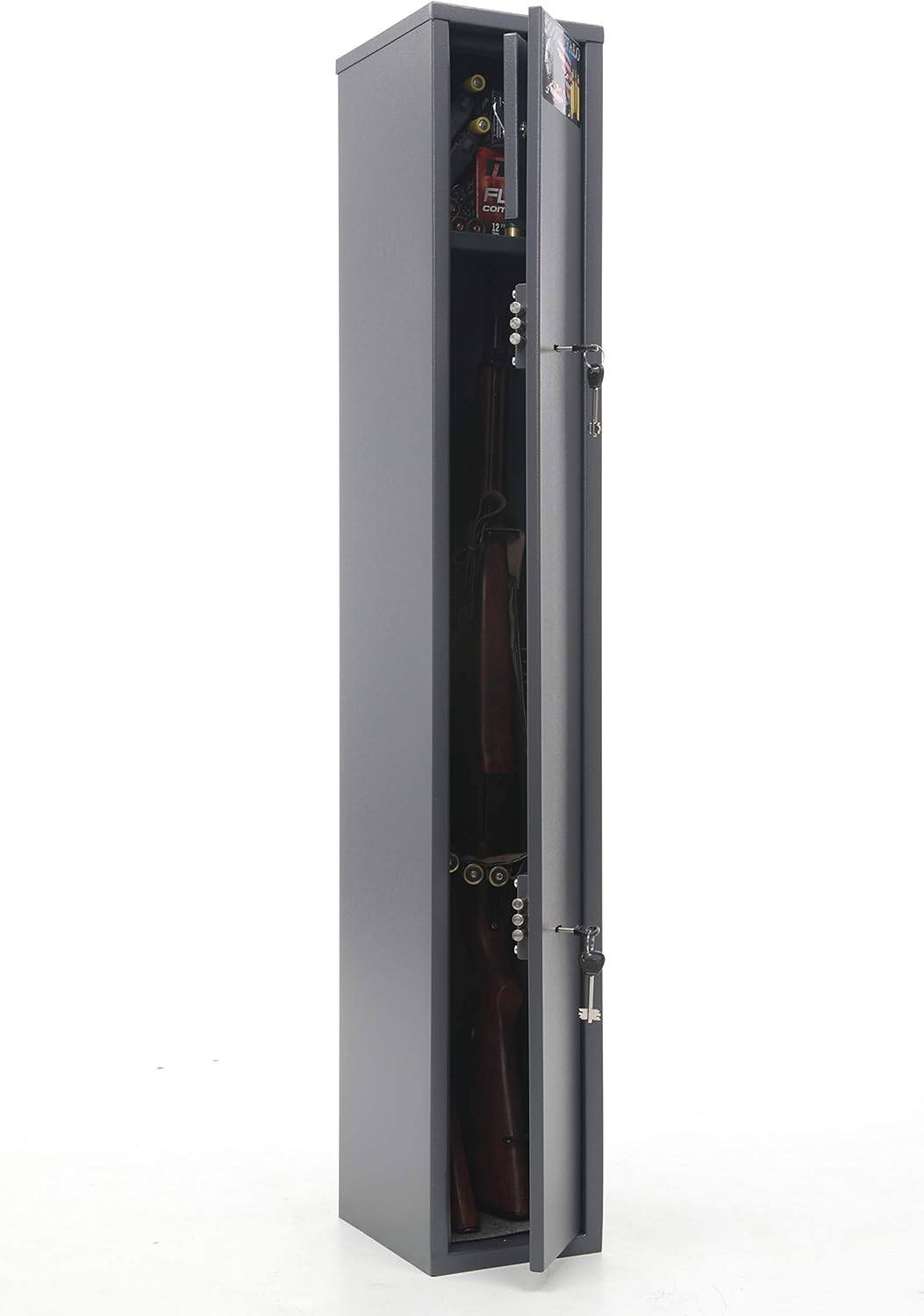 Protect your valuable collection of weaponry from a variety of elements including moisture and dust. This metal gun security cabinet comes equipped with two separate storage areas which are suitable for storing rifles and pistols in their own compartments. The unit is made with two key locks for safety. Each key lock features three live-locking bolts. Live-locking bolts provide advanced protection against theft. This gun safe is capable of housing two long weapons up to 50.3" tall. It has a separate lock box that provides additional storage for accessories and ammo. Longer guns can be stored in the back of the cabinet as the lock box is positioned in the front of the cabinet. There are anchor holes available for fixing the safe to the wall. You can display this gun storage cabinet with pride in almost any room in your home. It is slim enough to fit in most spaces. You can rest easy knowing your guns are securely put away.