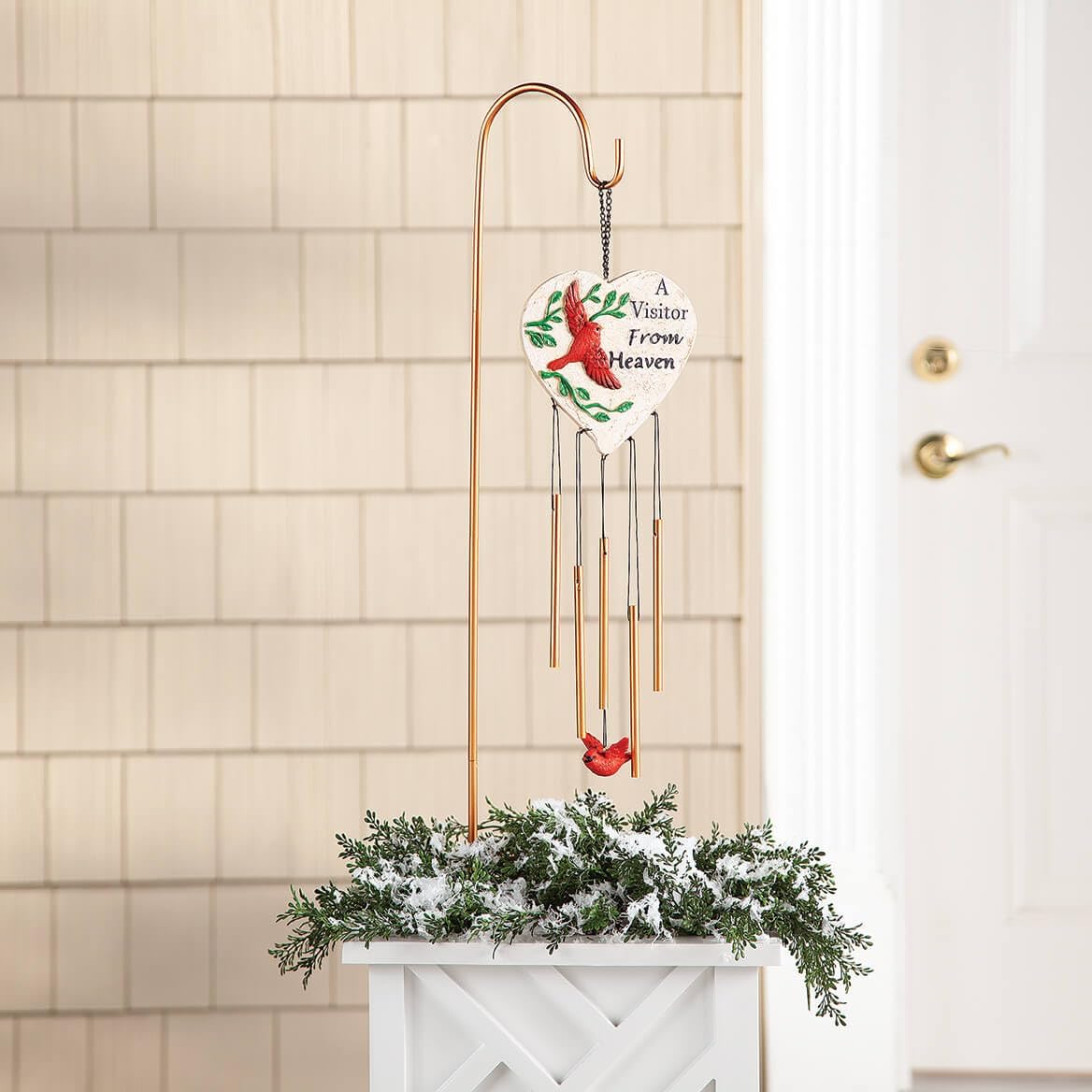 This Cardinal Memorial Wind Chime Stake offers a perfect way to keep the memory of a loved one close. A large-heart-shaped hanger features the comforting message, "A Visitor From Heaven," a gentle reminder that cardinals are thought to represent the spirit of those we miss. For an added touch, a cardinal charm dangles below the chime. Includes an iron shepherd's hook for easy placement in your yard. Memorial wind chimes made from resin and iron. Chimes are 6 3/8" long x 20 2/3" high. Shepherd's hook is 31 1/2" high. By Fox RiverTM Creations.