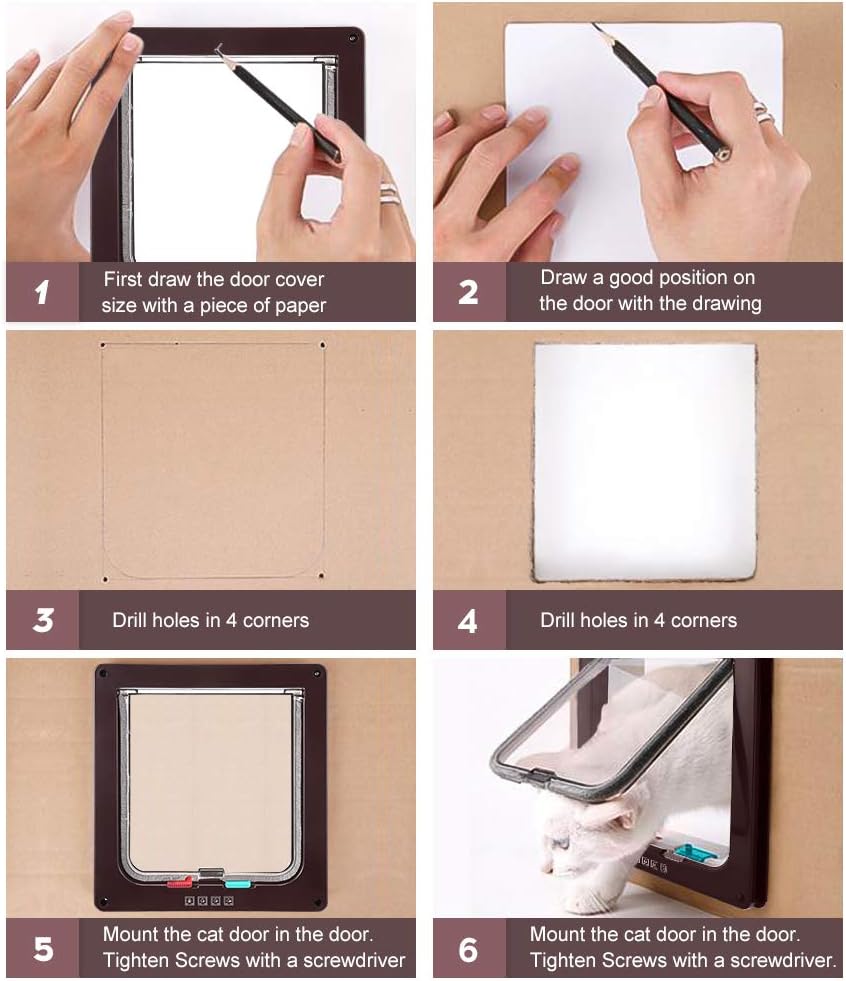 Features: Color: White, Brown, Black Size: S, M, L, XL. Item: Pet Door Type: Locking Valve Features: Lockable. ------------------------------------------------- Size S: Frame size: 19 x 20 cm (width x height). Door size: 14.5 x 15.5 cm (width x height). Thickness: 2.1cm Size M: Frame size: 19 x 20 cm (width x height). Door size: 14.5 x 15.5 cm (width x height). Thickness: 5.5cm Size L: Frame size: 23.5 x 25 cm (width x height). Door size: 18 x 19.5 cm (width x height). Thickness: 5.5cm Size XL: Frame size: 24.5 x 28.5 cm (width x height). Door size: 20 x 22 cm (width x height). Thickness: 5.5cm Ideal choice: dog, cat. Suitable for: door, panel, wall, glass. 4-way lock: fully open, fully locked, just enter, only take out. --------------------------------------------------------------- 1. Thanks to the transparent folding door, you and your pet can see what is on the other side of the door. 2. The white ABS telescopic frame closes it when needed. You will feel safer for your pet. 3. The four-way lock is optional and the brush can eliminate noise when closing the door. 4. It comes with the screws and magnets required to assemble both sides to keep the door closed when not in use. ------------------------------------------------------------ Package includes: 1 x cat flap. 8 x Long Screws 8 x Short Screws 1 x user manual.