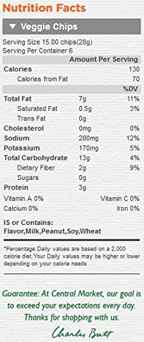Central Market Veggie Chips are cooked in expeller - pressed oil where they form the air pockets that create their light, crispy texture. They are dusted lightly with sea salt to compliment the flavor of the potato, spinach or tomato infused chip. They have 30% less fat when compared to regular potato chips. Enjoy them as a stand alone snack or with your favorite salsa or dip. Only 7 grams of fat per serving!