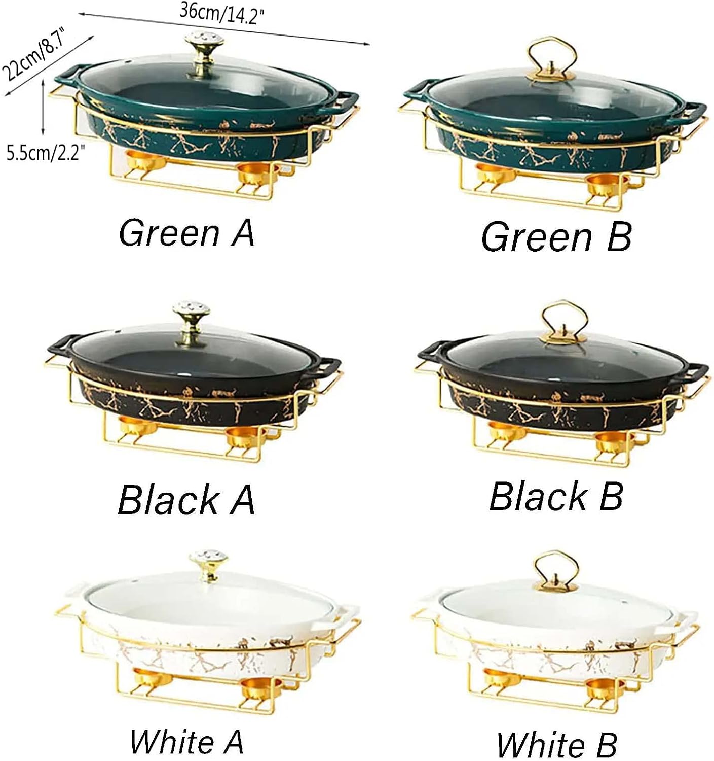 Product Description 1. Light heat heating, designed the most durable chafer dish which is not only long-lasting but will also keep your food warm for quite some time. 2. With lid button and handle design, easy to handle Ceramic material, suitable for a variety of home styles, creating a romantic gourmet life for you. Specification: Name: Oval ceramics dining stove Material: Metal Weight: 3.5kg Specification: 1.5L Products include: 1*ceramics Chafing Dish Tips: Due to the influence of light, screen and environment, the color of the project may be slightly different from the picture, the actual product shall prevail. Due to different measurement methods, the error is generally 1-2cm, and the error range is not within the quality range.