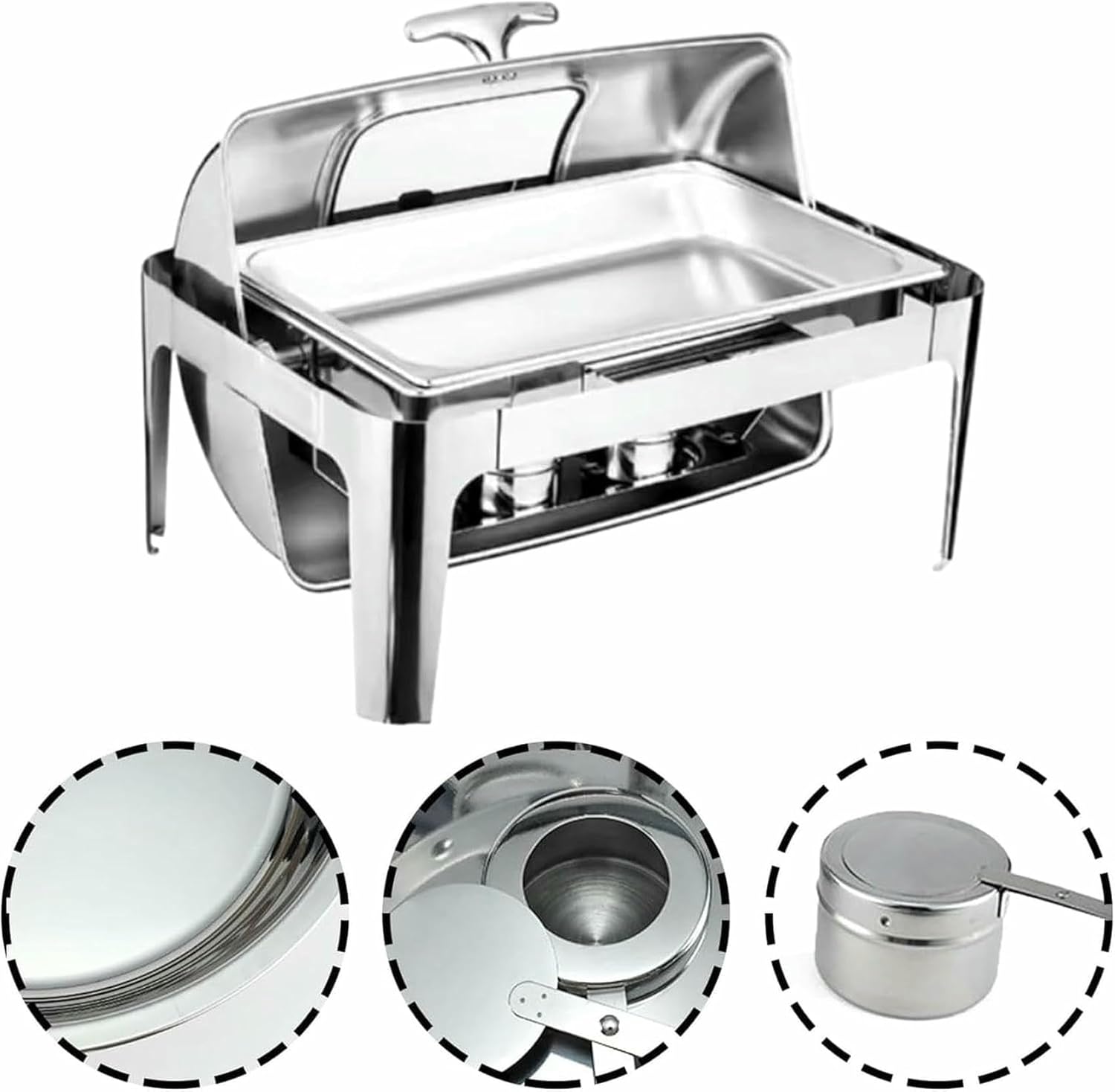 Product features: Smooth K: Our Chafing Dish is polished to the K and does not cut into the hands.In some competitive products, the K are not processed and you can easily cut your hands when you take them. Adjustable 0-180 °: The roller lid design saves more space.180 degrees completely open and 90 degrees half open offer more comfortable serving.You don't have to worry about where you put the lid down. Transparent glass windows: This rolltop chafing-disc buffet set with glass windows can shorten the opening times and keep the food fresh.The guest can easily see the food through the transparent window. Product size: Name: stainless steel self - furnace Ofen material: stainless steel, configuration: oven+water basin+dining basin+steel cover+bracket Color: stainless steel Capacity: 9 liter usable occasions: breakfast and dinner, parties, events, buffets, picnic, weddings, banquets, birthday parties, bankette