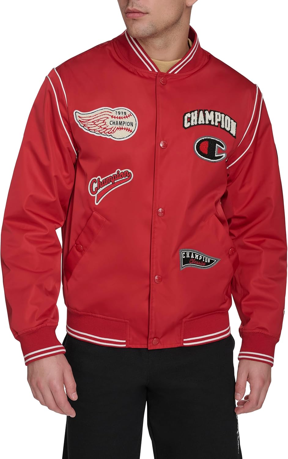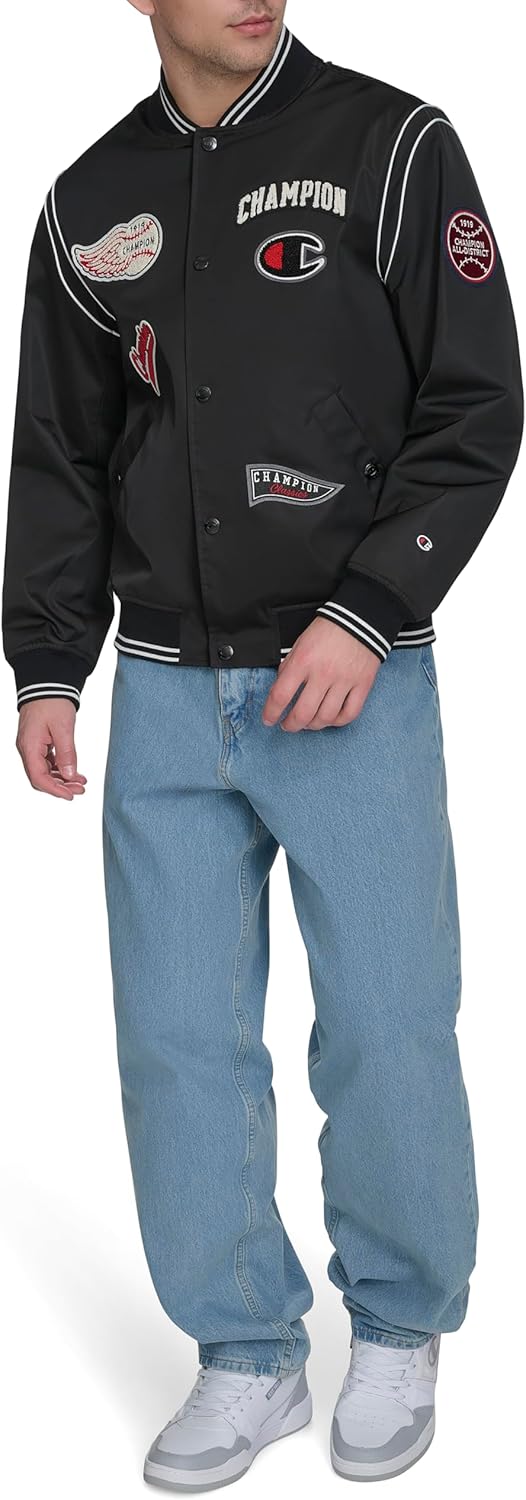 Functional Snap Pockets: Two lower snap pockets provide convenient storage for essentials. Secure Snap Closure: Center front snap closure for a secure and adjustable fit. Durable Construction: Made with high-quality materials for a lasting and stylish jacket that’s perfect for everyday wear. Rib Knit Detailing: Stripe rib knit at the cuff, hem, and collar adds a classic varsity touch and enhances comfort. Classic Varsity Style: Features a timeless design with iconic patches on the sleeve and chest for a standout, sporty look.