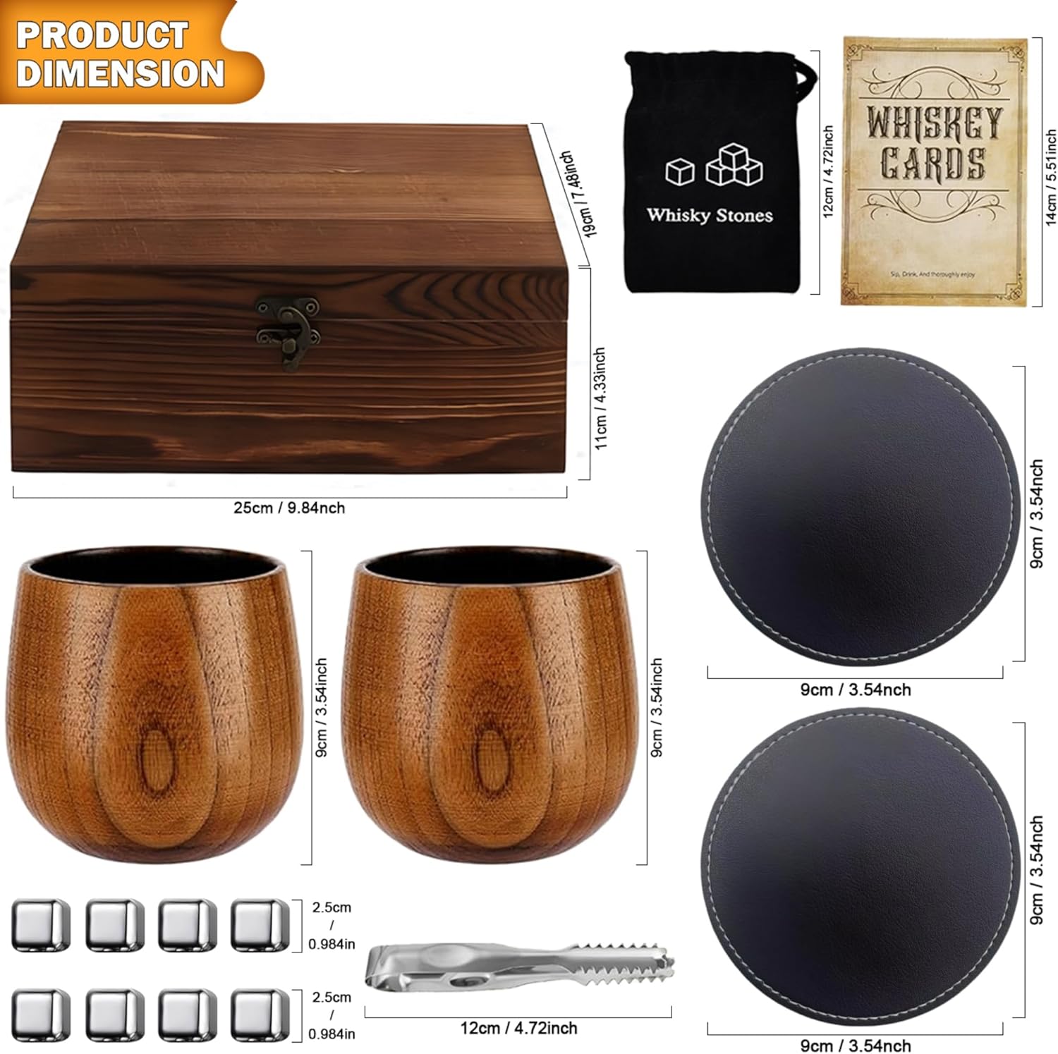 | Included Components | 1 Stainless Steel Tong, 1 Wooden Gift Box, 2 Premium Leather Coasters, 2 Premium charred wooden bourbon drinking glass, 8 stainless steel whiskey stones |