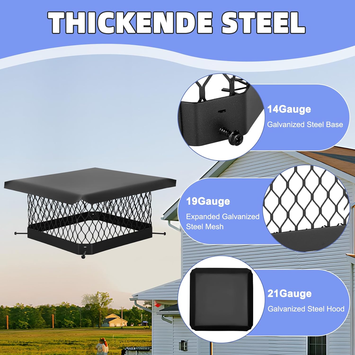 【MULTIPLE SIZE CHOICE】:Please choose the right size for you before purchasing, the 9IN*9IN size chimney cap can easily accommodate exterior chimney flue tiles ranging in size from 7 1/2“ x 7 1/2” to 9 1/2“ x 9 1/2”.