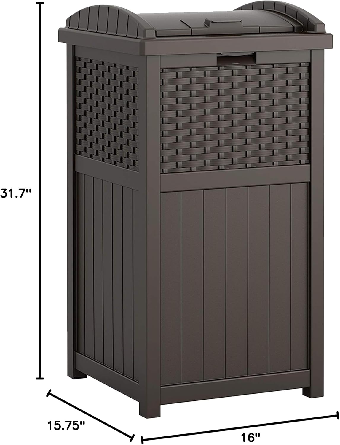 Christopher Knight Home Keaton Wicker Barrel Side Table, MultibrownThe Overton outdoor wicker barrel side table is stylish and convenient for your outdoor needs. With its contemporary shape, you can place it near your seating area to place snacks and beverages, or even use it as a stand for your Garden. Made of synthetic wicker you will find many uses for this table.Suncast 33 Gallon Hideaway Can Resin Outdoor Trash with Lid Use in Backyard, Deck, or Patio, 33-Gallon, BrownKeep unsightly garbage out of view with the Suncast 33 Gallon Resin Outdoor Hideaway Patio Trash Can. This patio trash can features a decorative wicker-style design for a stylish addition to your outdoor space. The decorative and functional waste bin is compatible with standard 30 gal. garbage bags for easy and convenient use. This trash can also features a secure latching design to help keep trash in and critters out. Constructed from durable resin that resists fading, this trash can is built to bring provide long-lasting use on your porch or patio. The Suncast 30 Gallon Resin Outdoor Hideaway Patio Trash Can measures 16" x 15.75" x 31.7" to keep your porch clean without taking up too much space. Suncast takes pride in helping customers enhance their indoor and outdoor spaces with quality products that are stylishly designed. You take pride in creating a beautiful environment. We take pride in keeping it that way.