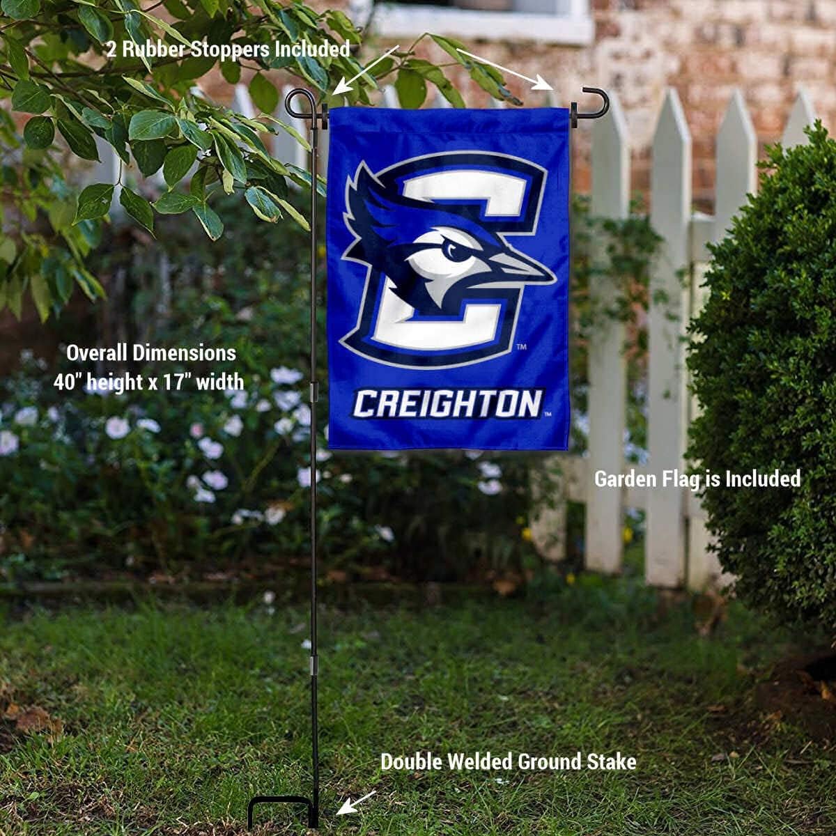 Creighton University Garden Flag and USA Flag Stand Pole Holder Set is an ideal set for your yard, garden, walkway, mailbox, or home entrance. This bundle includes your selected 13" x 18" Double Sided College Garden Flag, a Single Ply 12 x 18 inch USA Garden Flag, and a Sturdy Steel Powder Coated Garden Flag Stand with 2 included Rubber Stoppers. The garden flag measures 13x18 inches, is made of 2-Ply Polyester with sewn-in liner, is Double Sided Screen Printed, has a top pole sleeve for inserting the included Garden Flag Holder. The Garden Flag Stand measures an assembled height of 40" and has a flag crossbar width of a large 17". Also, the stand is made of steel, is powder coated black for rust resistance, and the ground stake is made with double welds for extra durability. A unique gift, our set is ready to fly and no tools are needed for assembly. The Flag is Officially Licensed and College and University Approved.